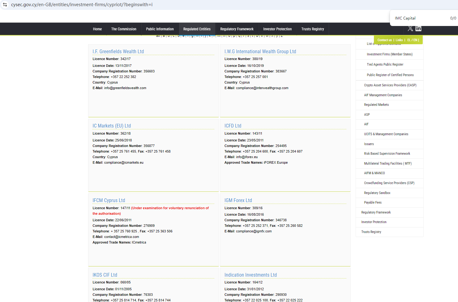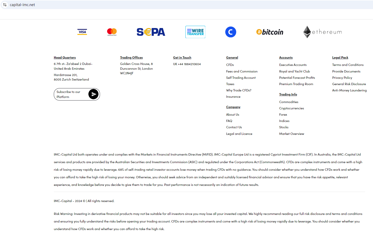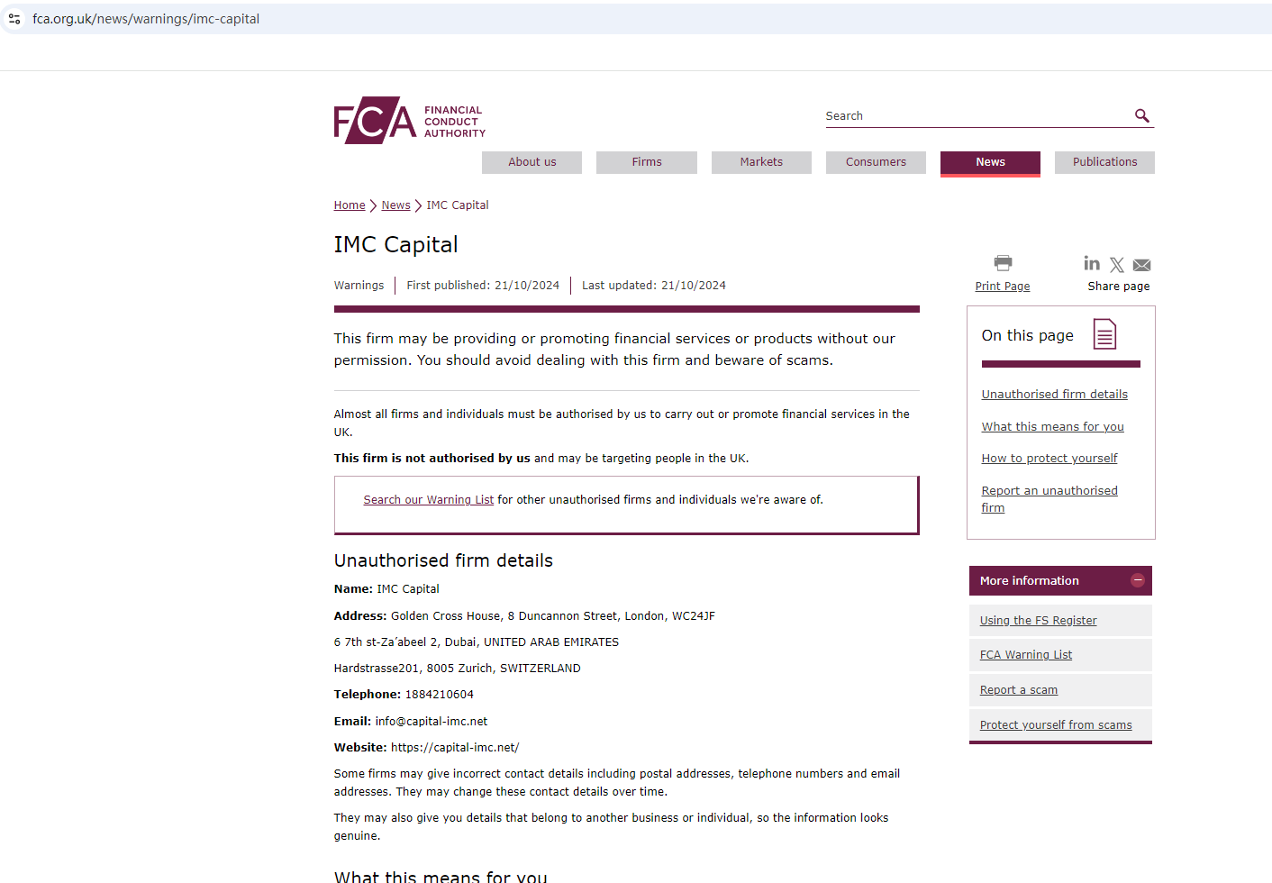 On 21 October 2024, the United Kingdom Financial Conduct Authority (FCA) issued a warning against IMC Capital, believing this company might be providing financial services or products without authorisation in the UK. You may visit: https://www.fca.org.uk/news/warnings/imc-capital