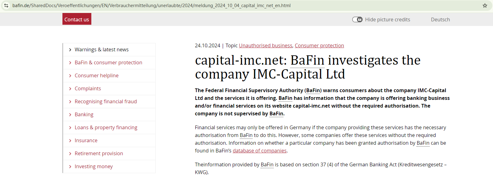 On October 24, 2024, the Federal Financial Supervisory Authority (BaFin) warned consumers about the company IMC Capital Ltd and the services it is offering. BaFin has information that the company is offering banking business and/or financial services on its website capital-imc.net without the required authorization. The company is not supervised by BaFin. https://www.bafin.de/SharedDocs/Veroeffentlichungen/EN/Verbrauchermitteilung/unerlaubte/2024/meldung_2024_10_04_capital_imc_net_en.html