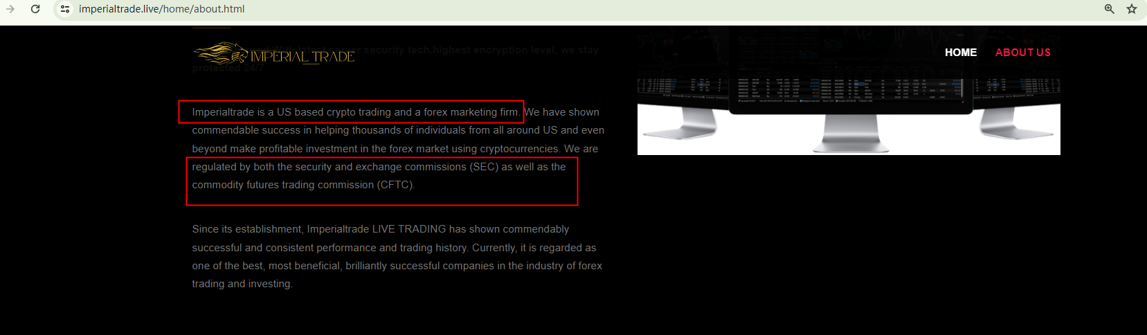 Unknow operators providing unlicensed financial services through the website imperialtrade.live. This platform claims to be regulated by the Commodity Futures Trading Commission (CFTC) and the U.S. Securities and Exchange Commission (SEC), but fails to provide any specific details to support these assertions. Such vague and insufficient regulatory claims raise serious concerns.