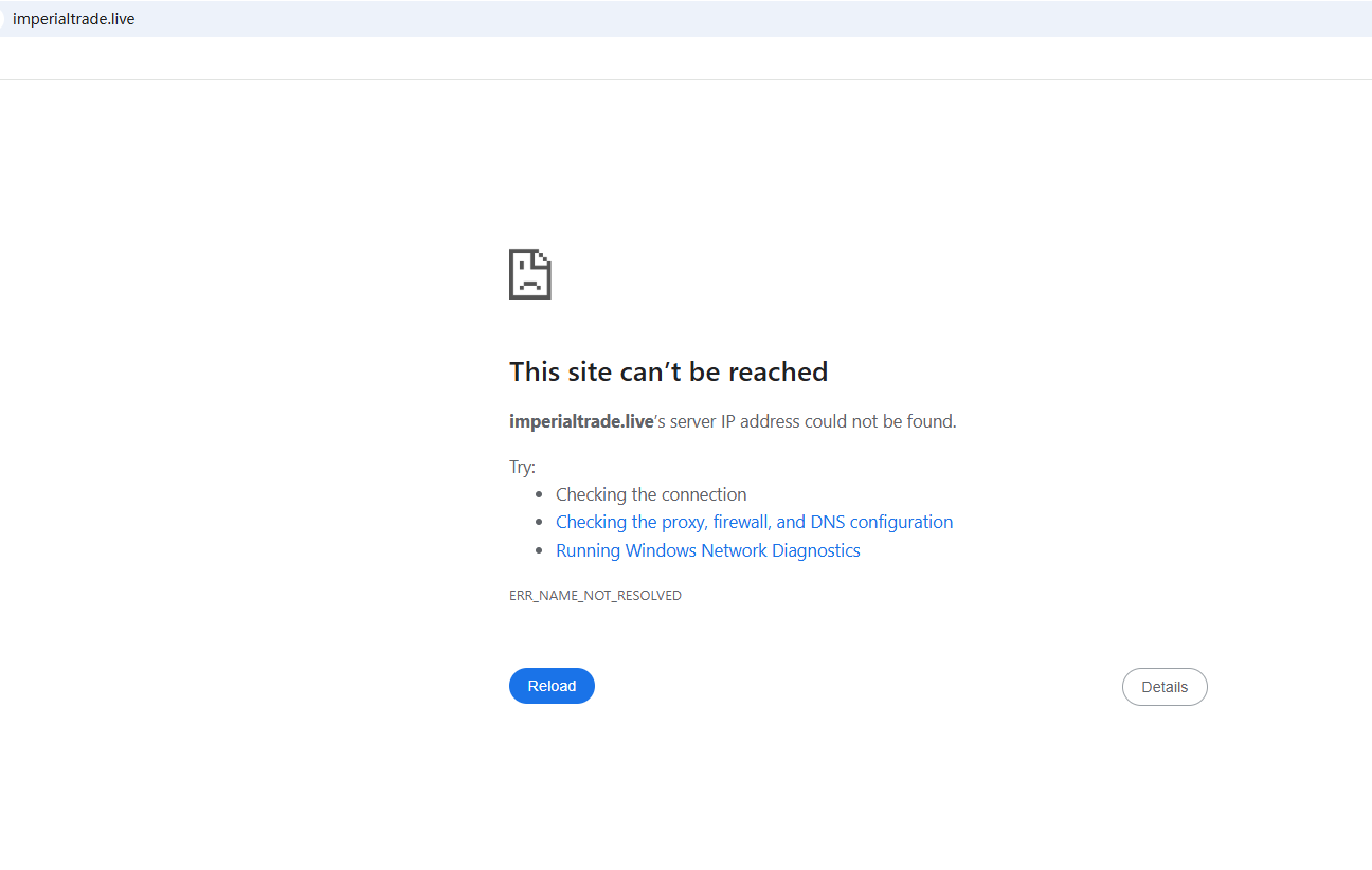BrokersView found that the domain "https://imperialtrade.live/" is currently inaccessible. This is widely regarded as a significant red flag, as the suspension of a broker's website often points to underlying regulatory or operational issues.