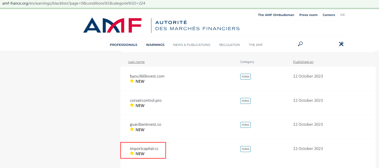 On October 12, 2023, the Financial Authority (Autorité des Marchés Financiers, AMF) added ImportCapital to warning list for it being an unauthorized company engaging in forex activities. https://www.amf-france.org/en/warnings/blacklists?page=0&conditions%5Bcategorie%5D=224