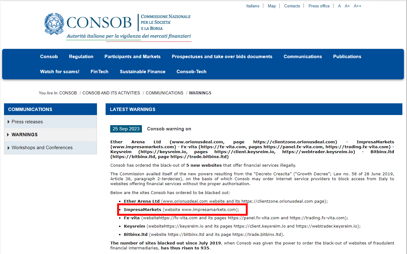On 25 September 2023, the Commissione Nazionale per le Società e la Borsa (CONSOB) issued a warning that ImpresaMarkets was providing financial services or products without authorisation. You may visit: https://www.consob.it/web/consob-and-its-activities/warnings?viewId=ultime_com_tutela