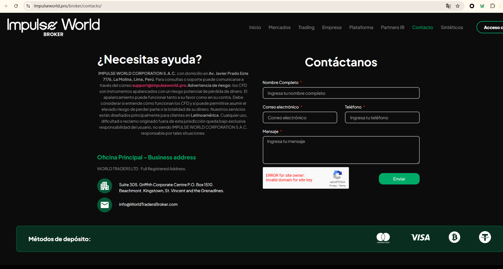 Impulse World Broker's website provides no verifiable details about regulatory oversight and only mentions that its operating entity, IMPULSE WORLD CORPORATION S.A.C., is registered in Peru. However, it is important to note that Peru does not currently have a regulatory body authorized to supervise forex trading activities. As a result, investors exposed to substantial financial and legal risks.