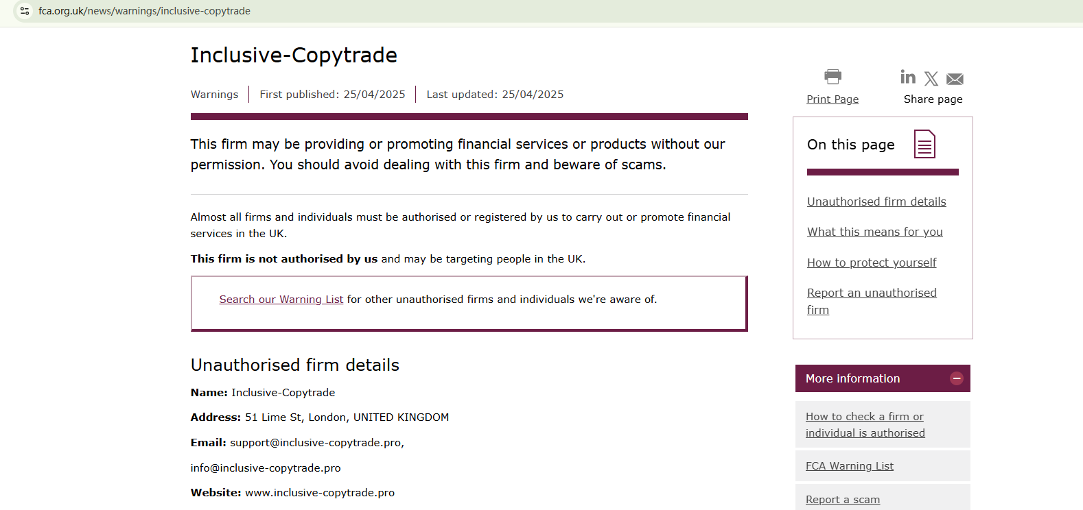 On April 25, 2025, the Financial Conduct Authority (FCA) issued a warning against Inclusive Copytrade, believing this company might be providing financial services or products without proper authorization in the UK. https://www.fca.org.uk/news/warnings/inclusive-copytrade
