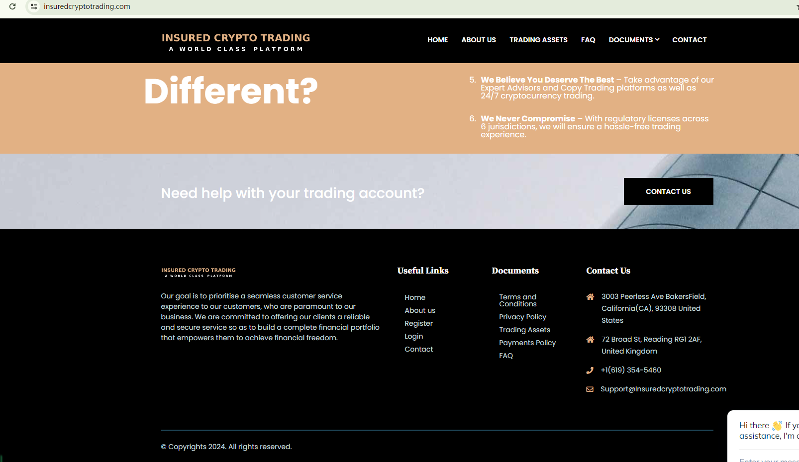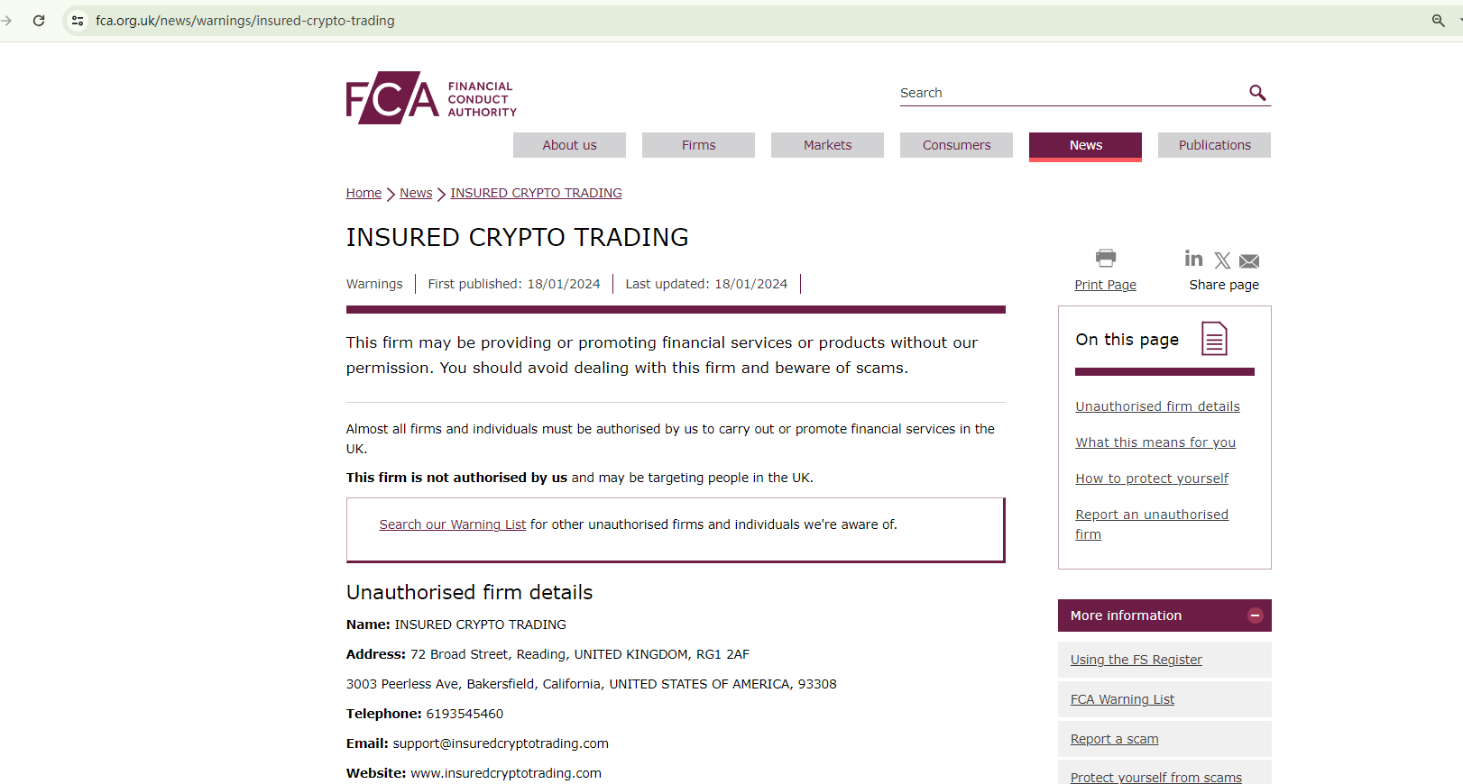 On January 18, 2024, the Financial Conduct Authority (FCA) issued a warning against INSURED CRYPTO TRADING, believing this company might be providing financial services or products without proper authorization in the UK. https://www.fca.org.uk/news/warnings/insured-crypto-trading