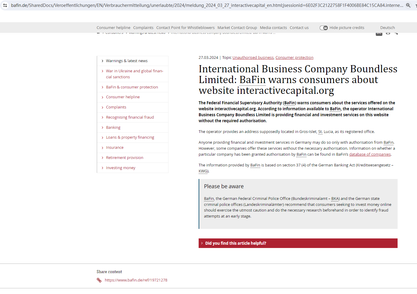 In addition, the Federal Financial Supervisory Authority (BaFin) warned consumers about the company Interactive Capital Сorp and the services it is offering. BaFin suspects the unknown operators of the website interactivecapital.org of offering consumers financial and investment services without the required authorization.