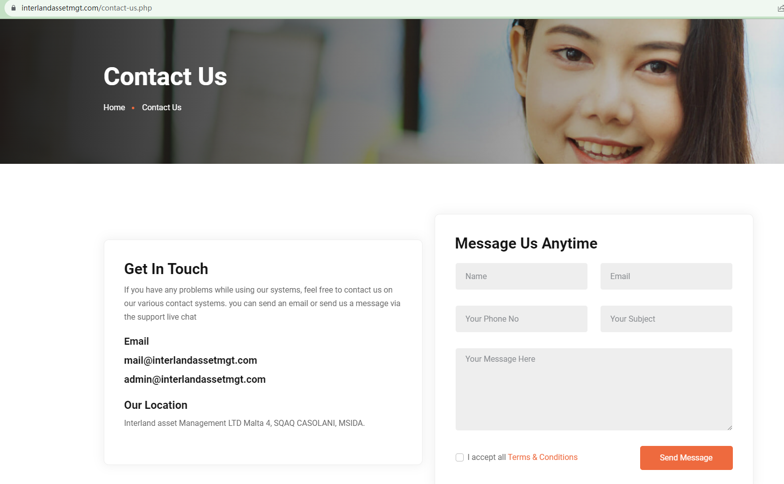 While Interland Asset management possesses two website addresses for facilitating trading, neither of it provides regulatory information. We only know that it is in Malta.