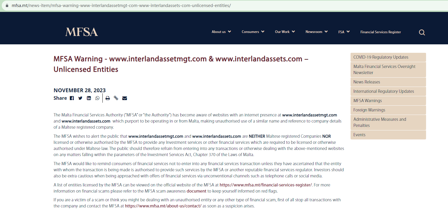 On November 28, 2023, the Malta Financial Services Authority (MFSA) issued a warning against Interland Asset management, stating this broker is neither a Maltese registered company nor licensed or otherwise authorised by the MFSA to provide any investment services or other financial services which are required to be licensed or otherwise authorised under Maltese law. https://www.mfsa.mt/news-item/mfsa-warning-www-interlandassetmgt-com-www-interlandassets-com-unlicensed-entities/