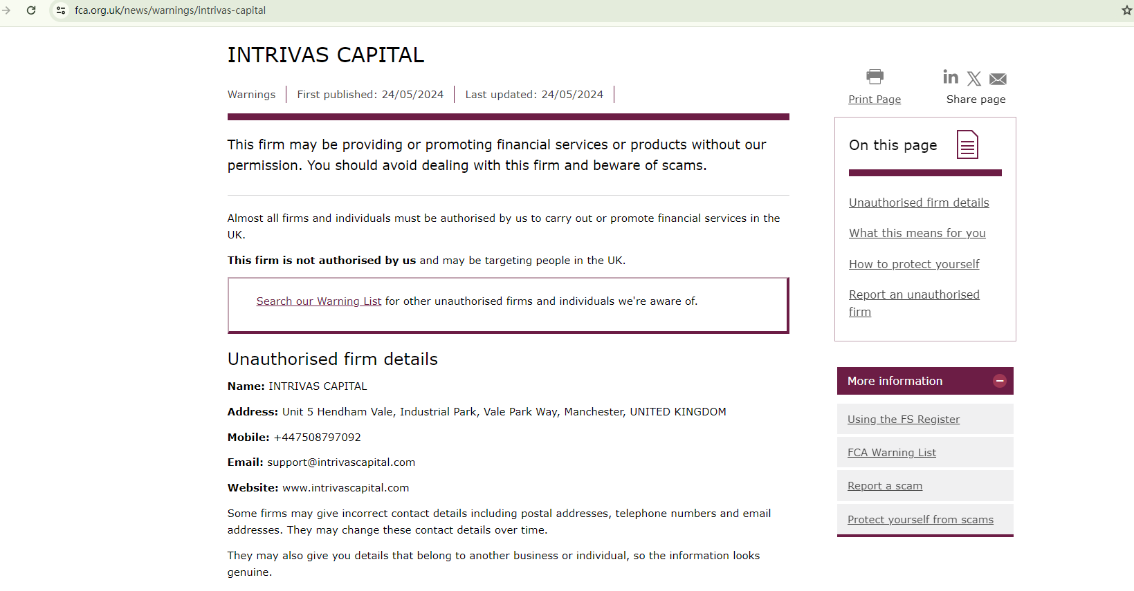 On May 24, 2024, the Financial Conduct Authority (FCA) issued a warning against INTRIVAS CAPITAL, believing this company might be providing financial services or products without proper authorization in the UK. https://www.fca.org.uk/news/warnings/intrivas-capital