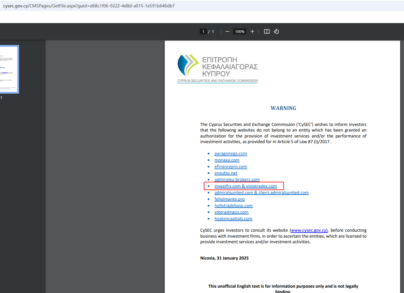 On January 31, 2025, the Cyprus Securities and Exchange Commission (CySEC) warned consumers about the services offered by the company Invest Frx, which is offering financial and investment services without the required authorization. https://www.cysec.gov.cy/CMSPages/GetFile.aspx?guid=d68c1f06-9222-4d8d-a015-1e591b646db7