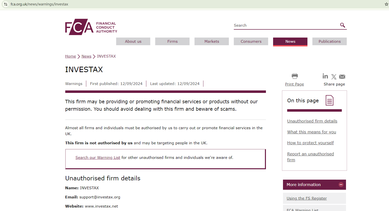 However, the UK's Financial Conduct Authority (FCA) has issued a warning about Investax, identifying it as an unauthorized firm and alerting investors to the potential scam.