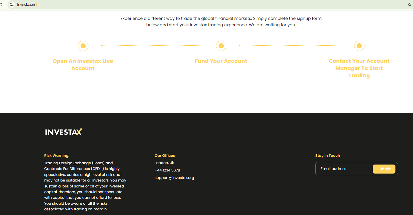 Investax's website mirrors those of previously flagged fraudulent brokers, starting with the slogan "Step into the trading arena with confidence & [broker's name]." The broker lacks valid licensing details to prove its legitimacy and only provides a contact number starting with +44, suggesting it may be based in the UK.