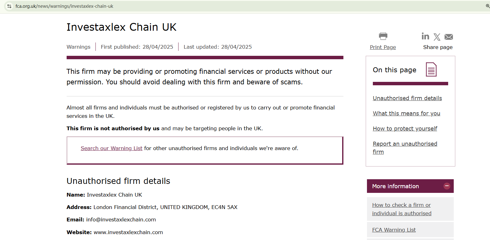 On April 25, 2025, the Financial Conduct Authority (FCA) issued a warning against Investaxlex Chain UK, believing this company might be providing financial services or products without proper authorization in the UK. https://www.fca.org.uk/news/warnings/investaxlex-chain-uk