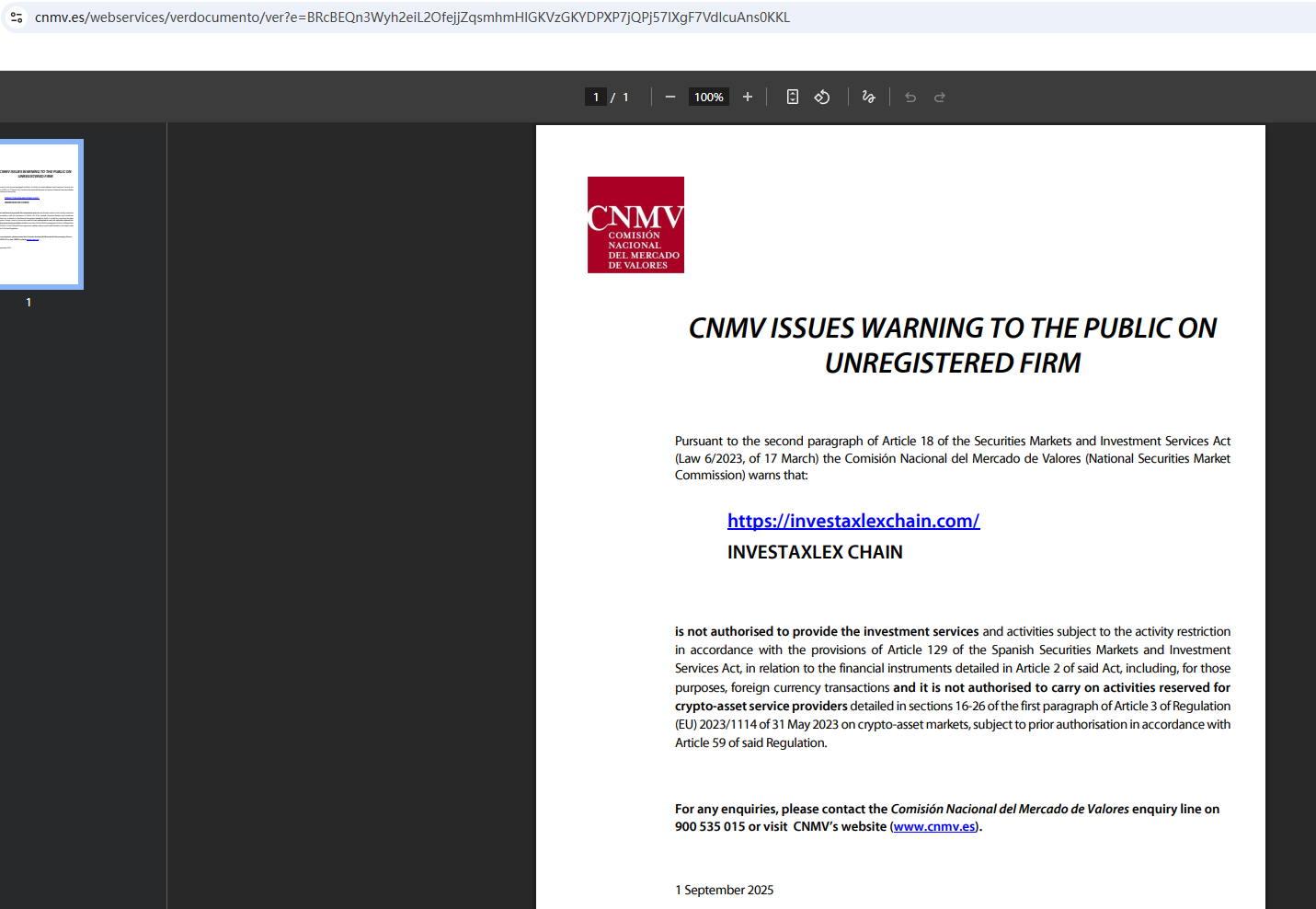On Sept 1, 2025, the National Securities Market Commission (CNMV) issued a warning against Investaxlex Chain UK, believing this company might be providing financial services or products without proper authorization. https://www.cnmv.es/webservices/verdocumento/ver?e=BRcBEQn3Wyh2eiL2OfejjZqsmhmHlGKVzGKYDPXP7jQPj57IXgF7VdIcuAns0KKL