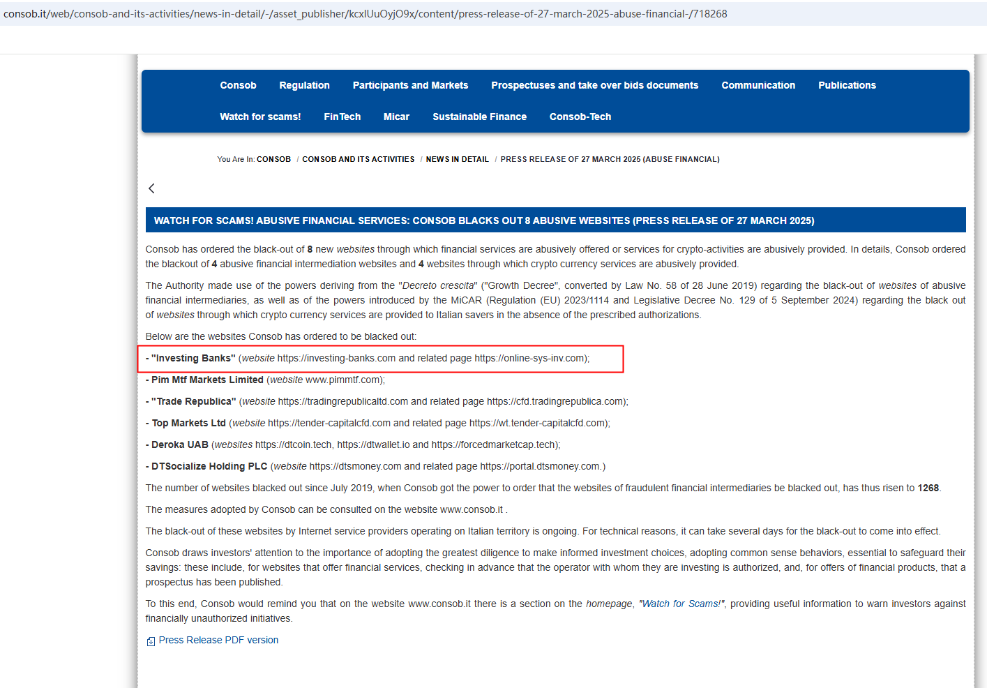 On March 27, 2025, the Italian Companies and Exchange Commission (CONSOB) ordered Investing Banks to be blacked out since it offer financial services illegally in Italy. https://www.consob.it/web/consob-and-its-activities/news-in-detail/-/asset_publisher/kcxlUuOyjO9x/content/press-release-of-27-march-2025-abuse-financial-/718268