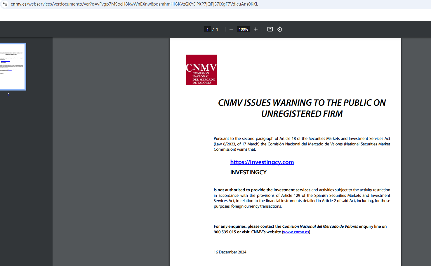 In addition, the Comisión Nacional del Mercado de Valores (CNMV) added INVESTINGCY to its warning list for providing investment services without authorization.