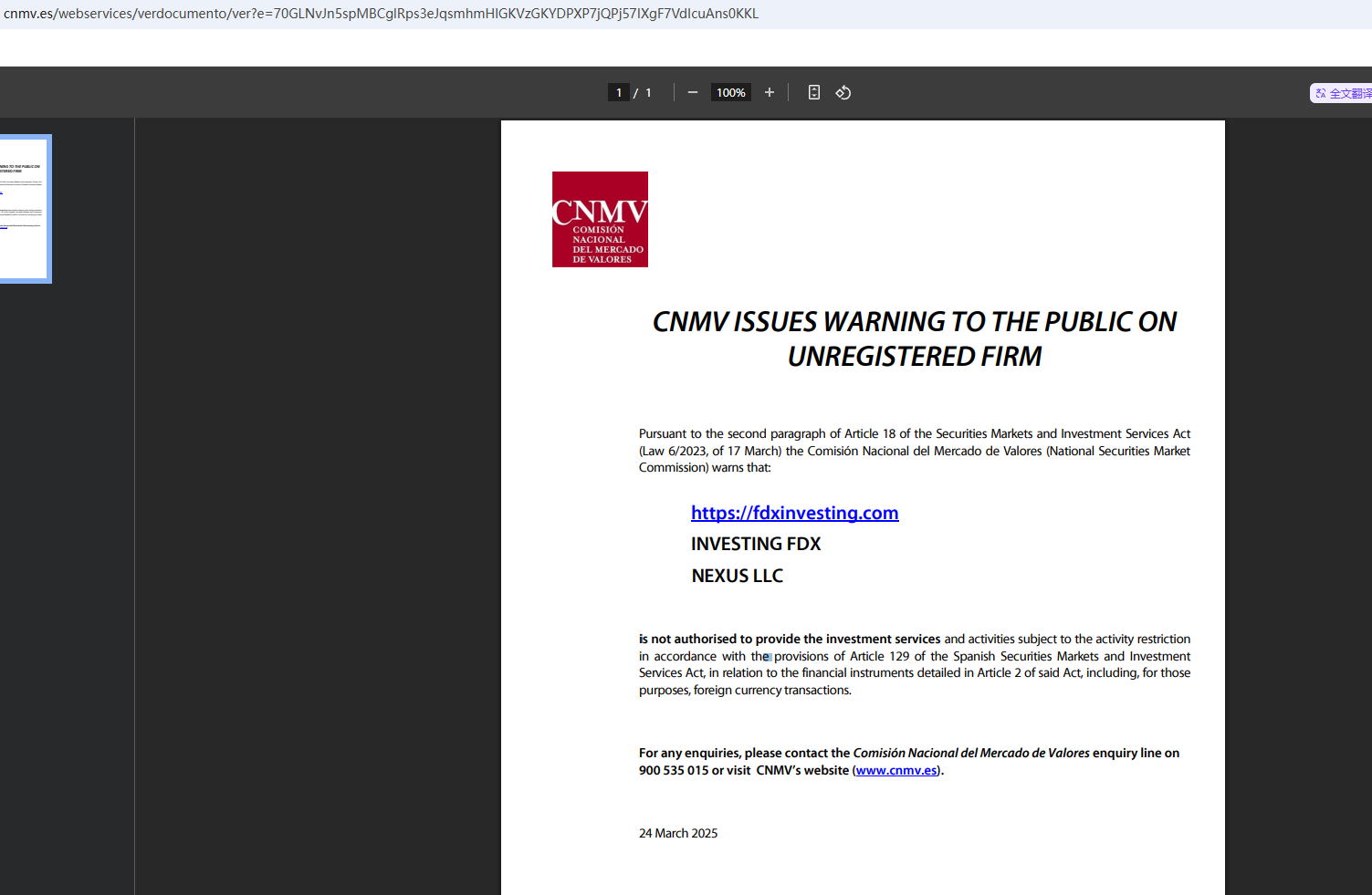On March 24, 2025, the Comisión Nacional del Mercado de Valores (CNMV) has added Investingfdx to its warning list for providing investment services without authorization. https://www.cnmv.es/webservices/verdocumento/ver?e=70GLNvJn5spMBCglRps3eJqsmhmHlGKVzGKYDPXP7jQPj57IXgF7VdIcuAns0KKL