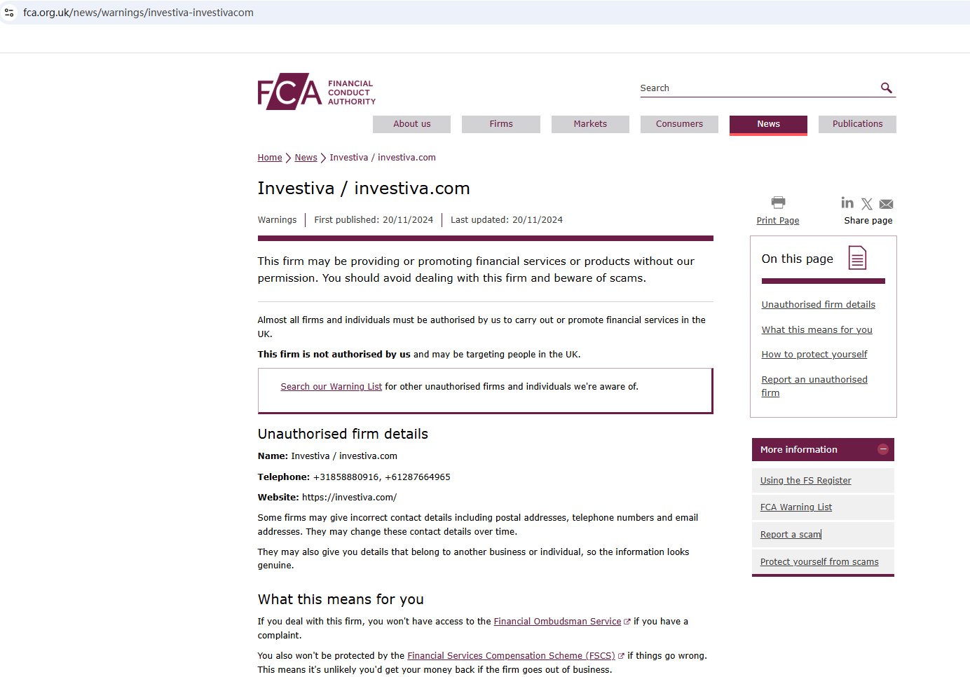 In addition, the Financial Conduct Authority (FCA) issued a warning against Investiva, believing this company might be providing financial services or products without proper authorization in the UK.