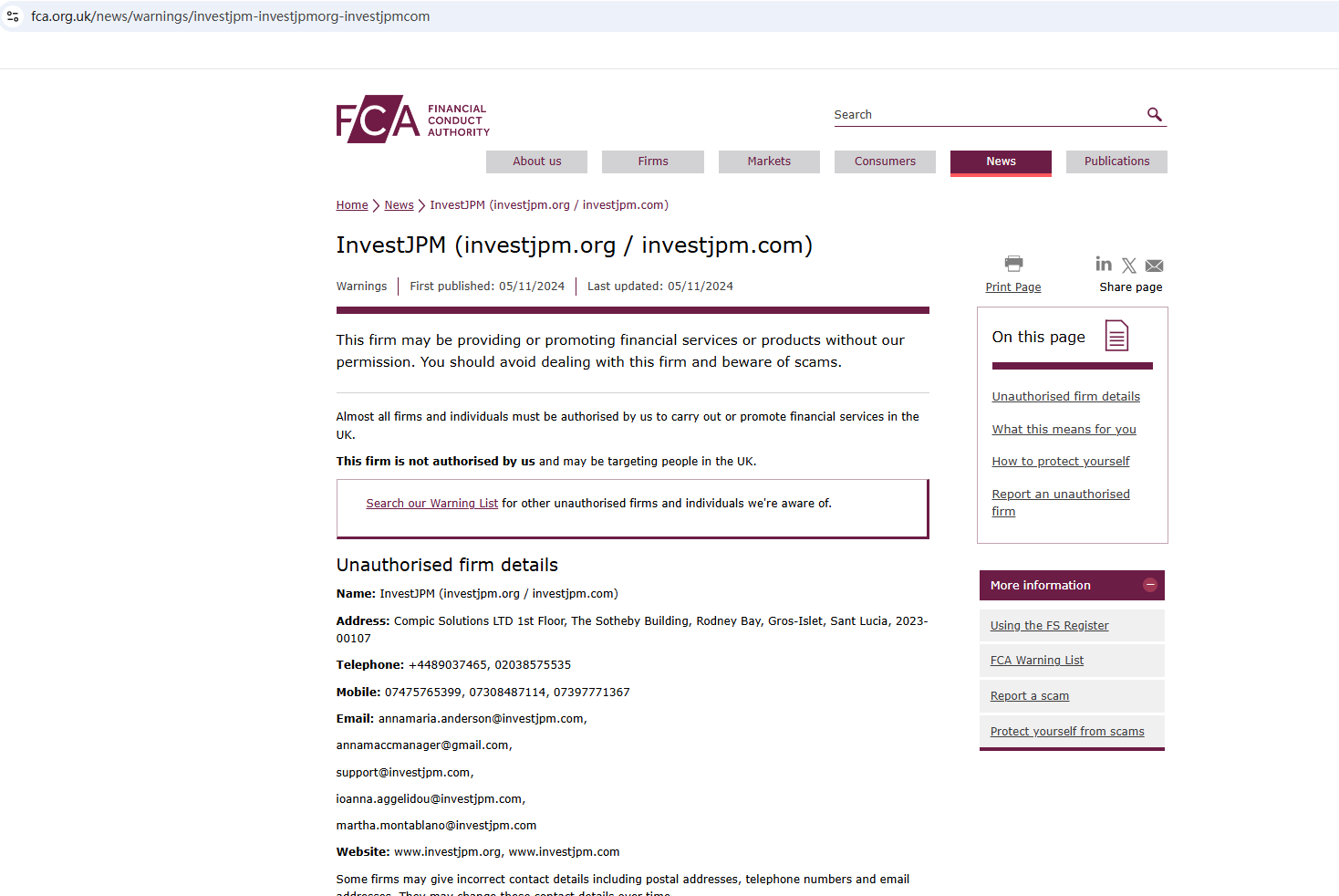 In addition, the Financial Conduct Authority (FCA) warned against InvestJPM, believing this company might be providing financial services or products without proper authorization in the UK.