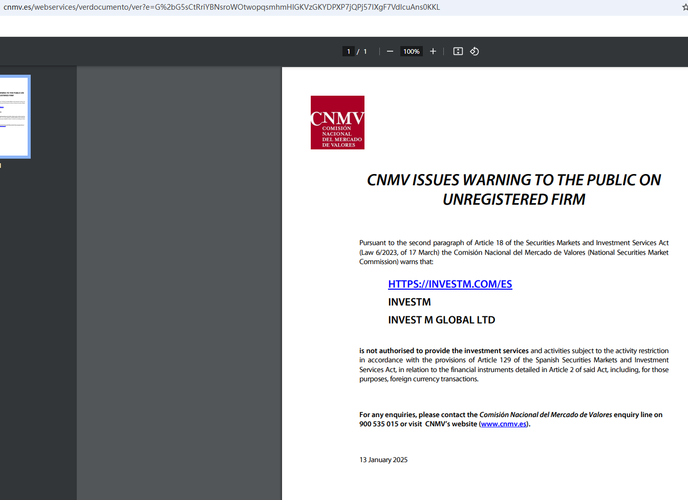 In addition, the National Securities Market Commission (CNMV) issued a warning against InvestM, believing this company might be providing financial services or products without proper authorization.