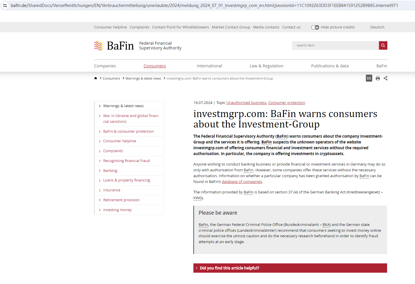 In addition, the Federal Financial Supervisory Authority (BaFin) warned consumers about the company Investment Group and the services it is offering at the website investmgrp.com, noting that it is operating without the required authorization.