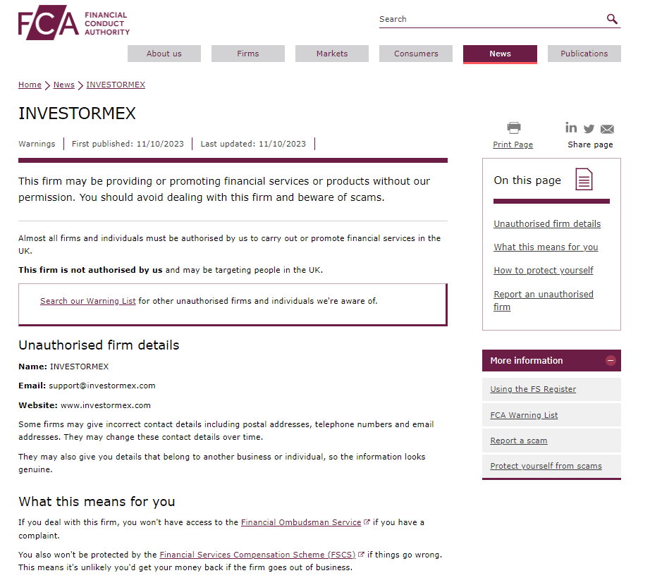 On 11 October 2023, the United Kingdom Financial Conduct Authority (UK FCA) issued a warning that INVESTORMEX was providing financial services or products in the UK without authorisation. You may visit: https://www.fca.org.uk/news/warnings/investormex