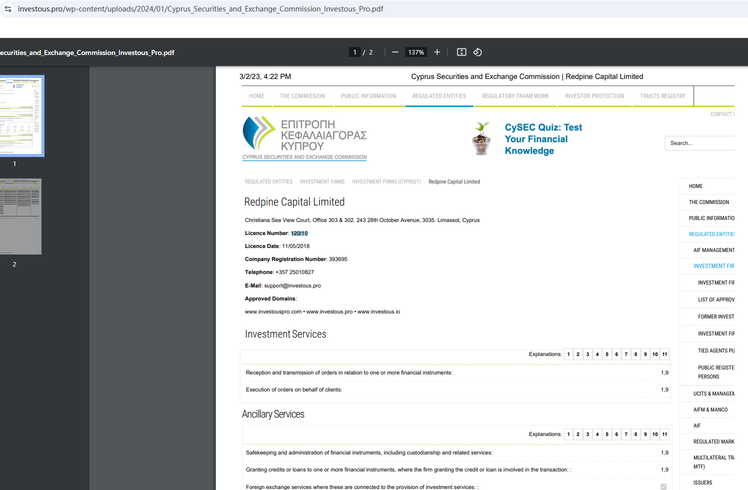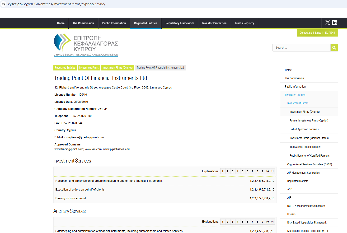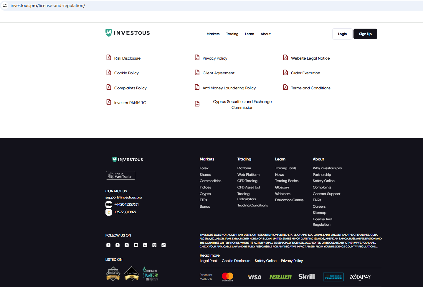 According to its website, it displays a Cyprus Securities and Exchange Commission (CySEC) hyperlink entrance on the website, trying to prove that it is legitimate. Clicking on the hyperlink, we were redirected to a CySEC certificate. Checking the CySEC number 120/10, we found that the number belongs to Trading Point Of Financial Instruments Ltd. It is obvious that investous.pro has stolen the regulatory information of compliant traders and used PS technology to replace the original with the fake. This is a very unreliable behavior.