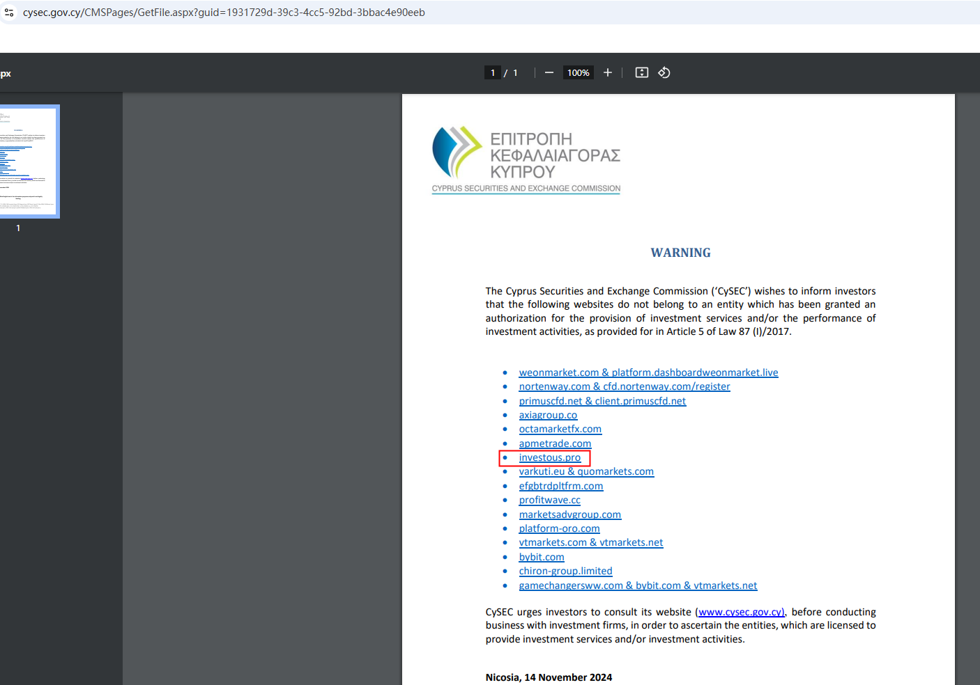 On Nov 14, 2024, the Cyprus Securities and Exchange Commission (CySEC) added investous.pro to its warning list, stating it does not belong to an entity which has been granted an authorization for the provision of investment services and/or the performance of investment activities. https://www.cysec.gov.cy/CMSPages/GetFile.aspx?guid=1931729d-39c3-4cc5-92bd-3bbac4e90eeb