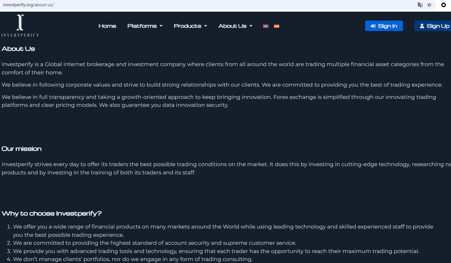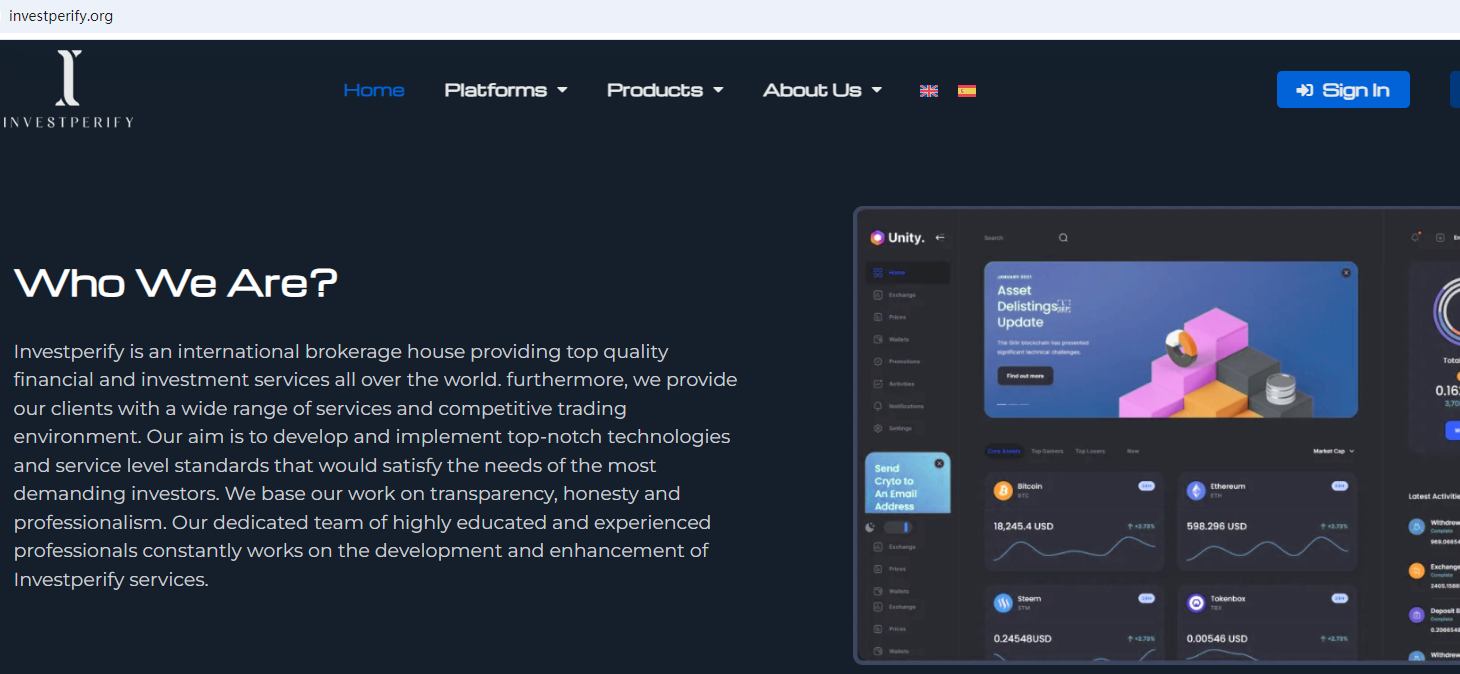 Investperify claims to be a global internet brokerage and investment company, offering a range of investment products to traders, including Forex, Commodities, Stocks, Indices, Future, Crypto and more instruments for trading in global markets. But it does not give information about his country of origin. A company that offers financial services must give an address and have a financial license in the country where it is located.