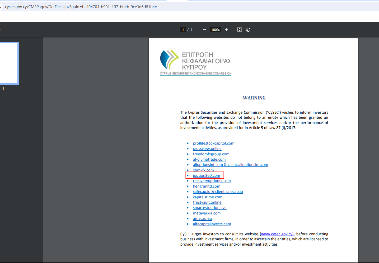 On 19 March 2024, the Cyprus Securities and Exchange Commission (CySEC) issued a warning that iOption360 was providing financial services or products without authorisation. You may visit: https://www.cysec.gov.cy/CMSPages/GetFile.aspx?guid=bc404704-b901-4ff7-bb4b-9ce3d6d81b4e