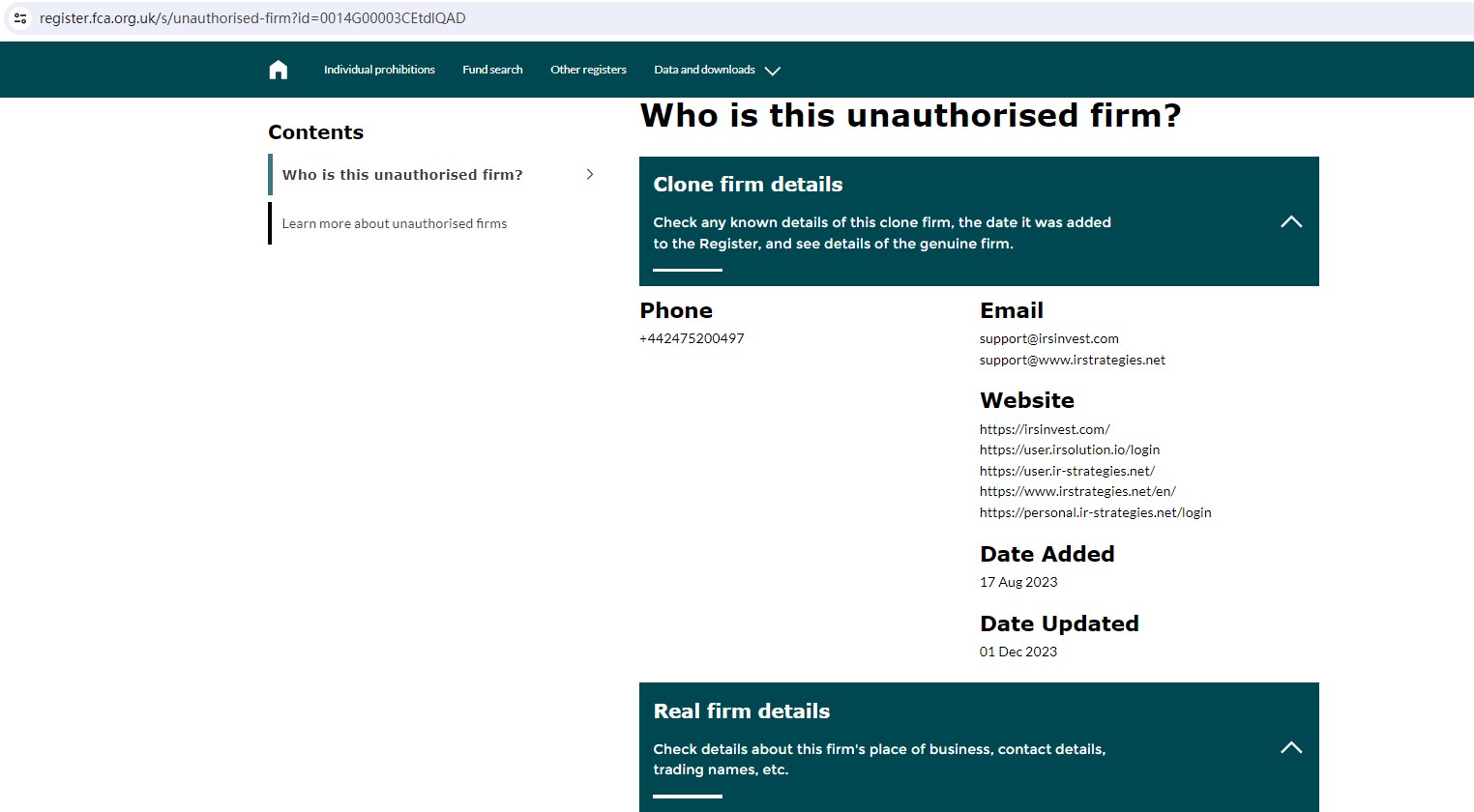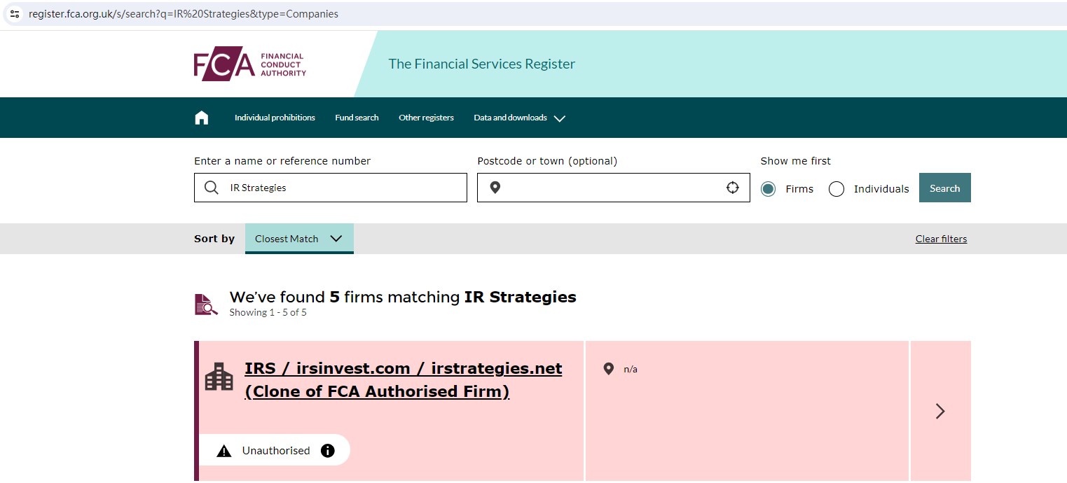 Upon investigation, we found that irstrategies.net is not Authorized by the United Kingdom Financial Conduct Authority (FCA).