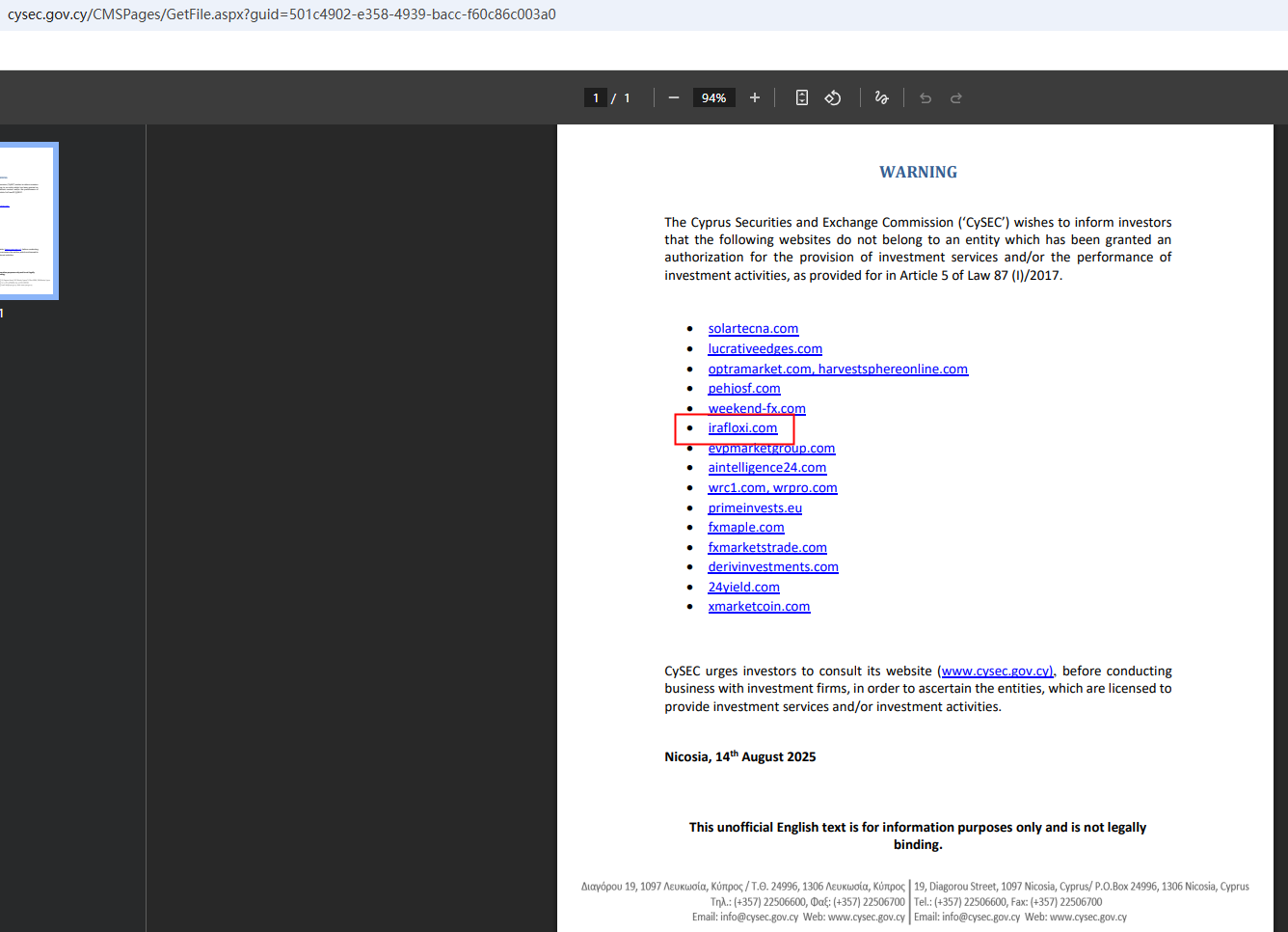 On Aug 14, 2025, the Cyprus Securities and Exchange Commission (CySEC) issued a warning against Irafloxi, believing this company might be providing financial services or products without authorisation. You may visit: https://www.cysec.gov.cy/CMSPages/GetFile.aspx?guid=501c4902-e358-4939-bacc-f60c86c003a0
