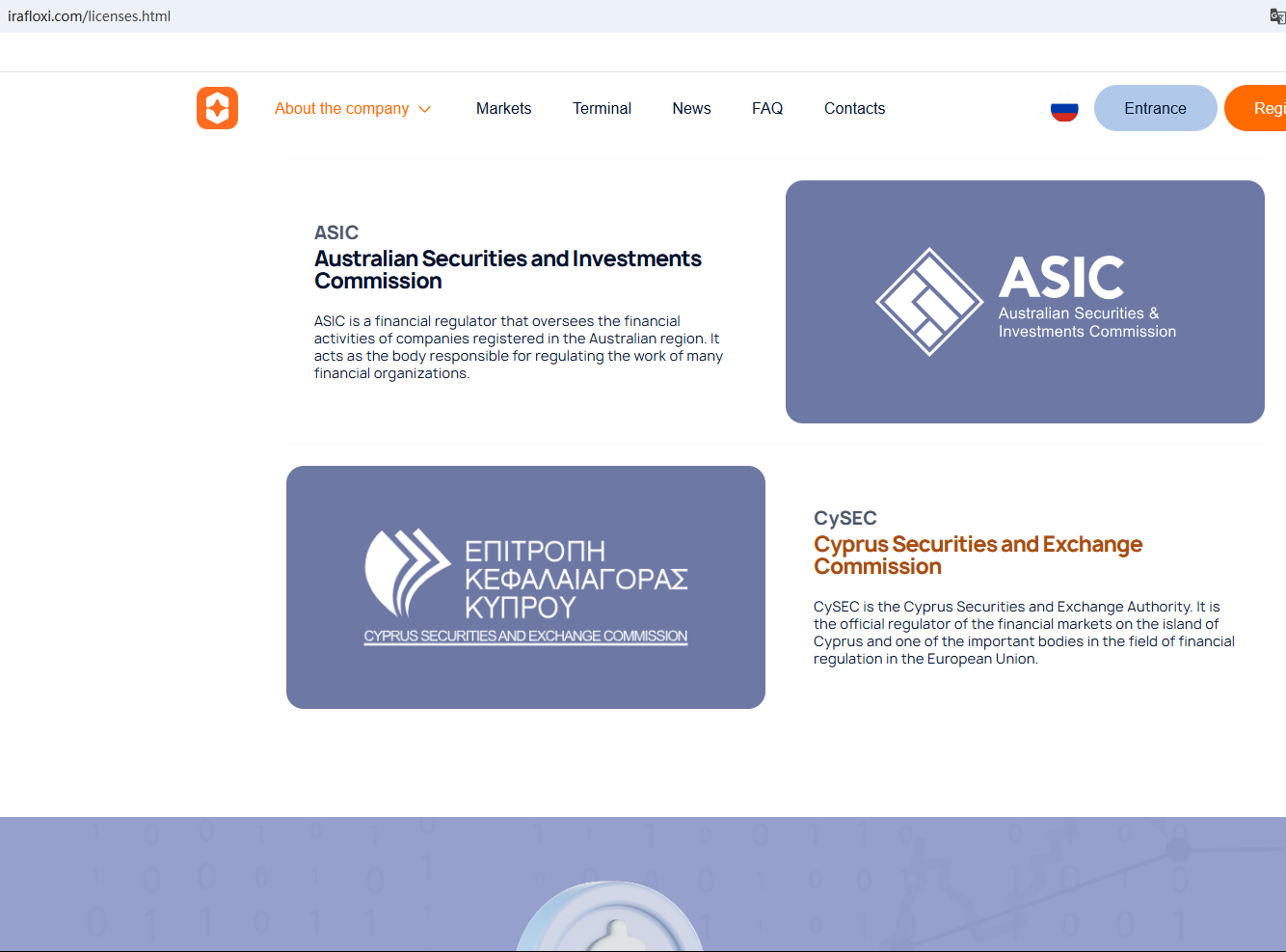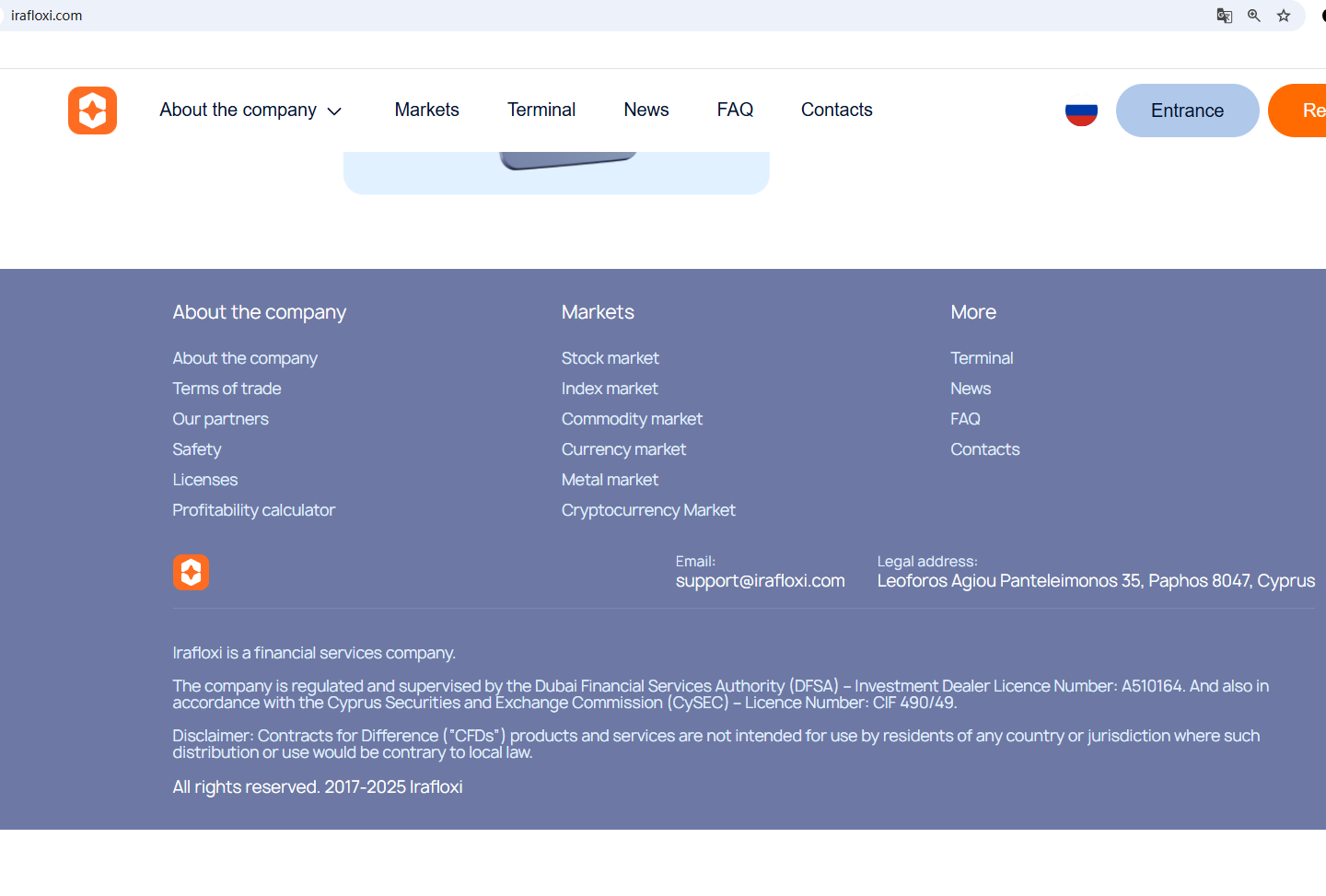 According to its website, it claims to be regulated by multiple regulatory bodies. Upon investigation, no matching information was found in the Australian Securities and Investments Commission (ASIC), the Financial Conduct Authority (FCA), the South African Financial Sector Conduct Authority (FSCA). In addition, the Cyprus Securities and Exchange Commission (CySEC) issued a warning against Irafloxi, believing this company might be providing financial services or products without authorisation.