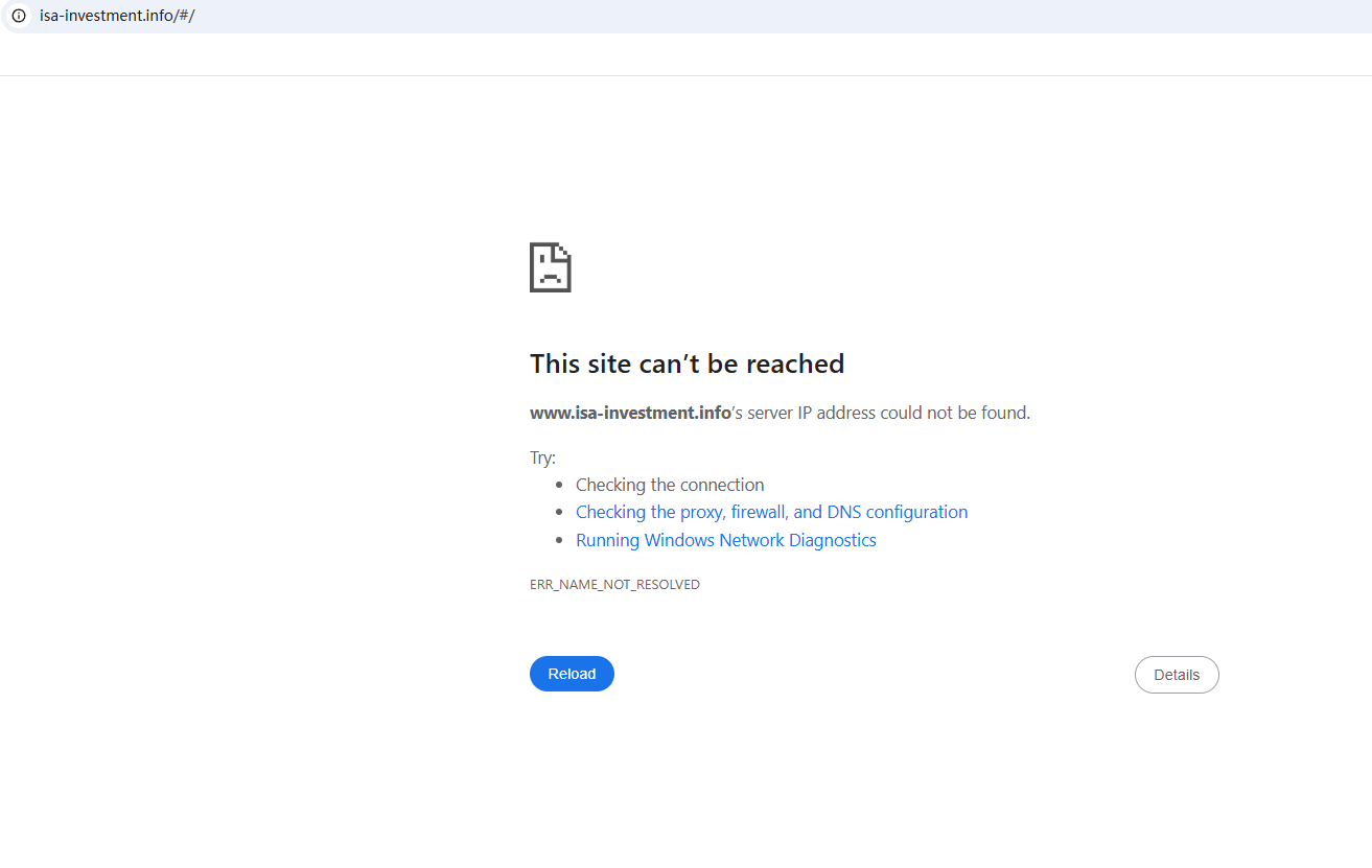BrokersView found that the domain "https://www.isa-investment.info/#/" is currently inaccessible. This is widely regarded as a significant red flag, as the suspension of a broker's website often points to underlying regulatory or operational issues.