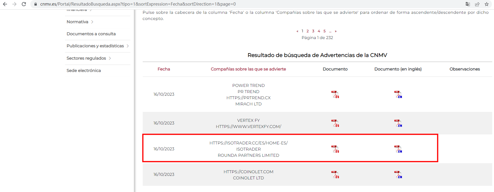 On 16 October 2023, the Comisión Nacional del Mercado de Valores (CNMV) issued a warning that ISOTRADER was providing financial services or products without authorisation. You may visit: https://www.cnmv.es/Portal/ResultadoBusqueda.aspx?tipo=1&sortExpression=Fecha&sortDirection=1&page=0