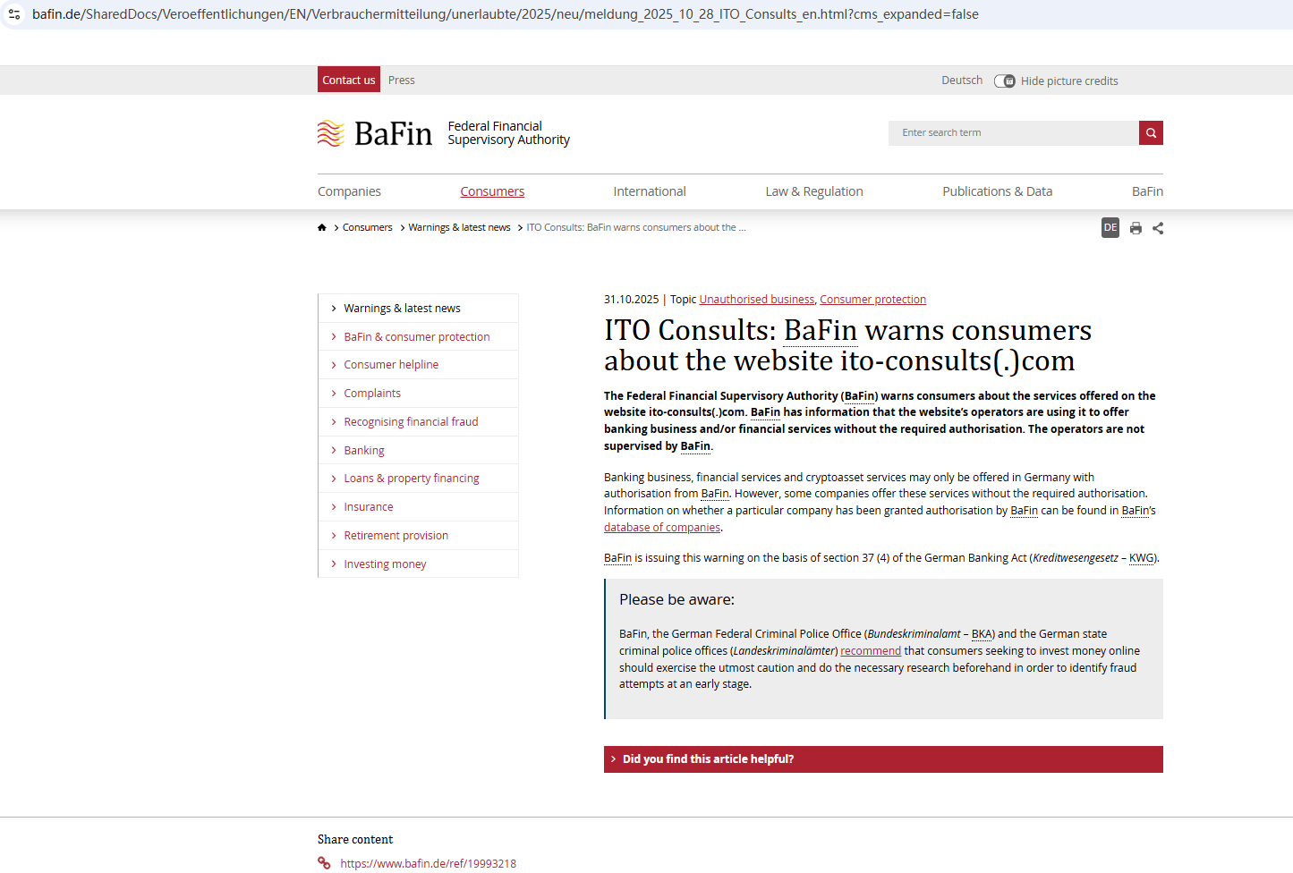 On Oct 31, 2025, the Federal Financial Supervisory Authority (BaFin) issued a warning against ITO Consults for the lack of the required authorization. https://www.bafin.de/SharedDocs/Veroeffentlichungen/EN/Verbrauchermitteilung/unerlaubte/2025/neu/meldung_2025_10_28_ITO_Consults_en.html?cms_expanded=false
