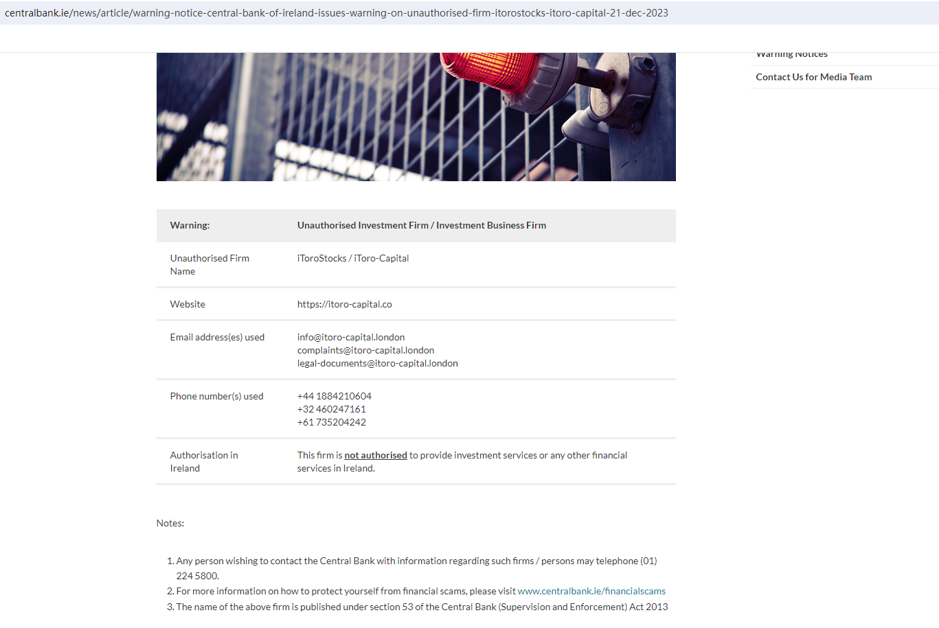 On 21 Dec 2023, the Central Bank of Ireland issued a warning that iToroStocks may be providing financial services or products without authorization. You may visit: https: https://www.centralbank.ie/news/article/warning-notice-central-bank-of-ireland-issues-warning-on-unauthorised-firm-itorostocks-itoro-capital-21-dec-2023