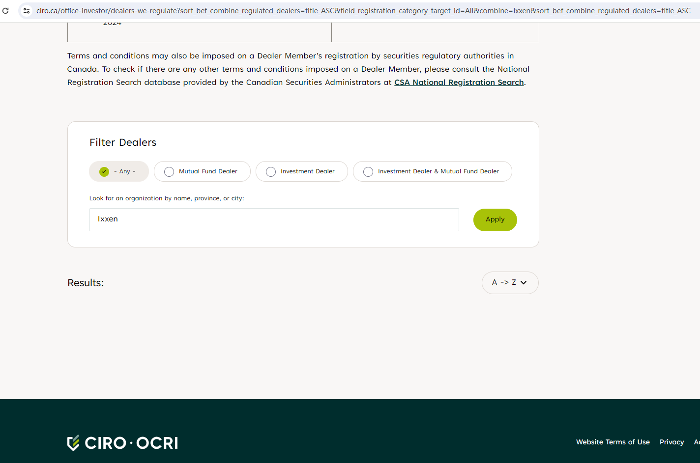 Ixxen locates in Canada, we searched the Investment Industry Regulatory Organization of Canada (IIROC) but found no matching results.