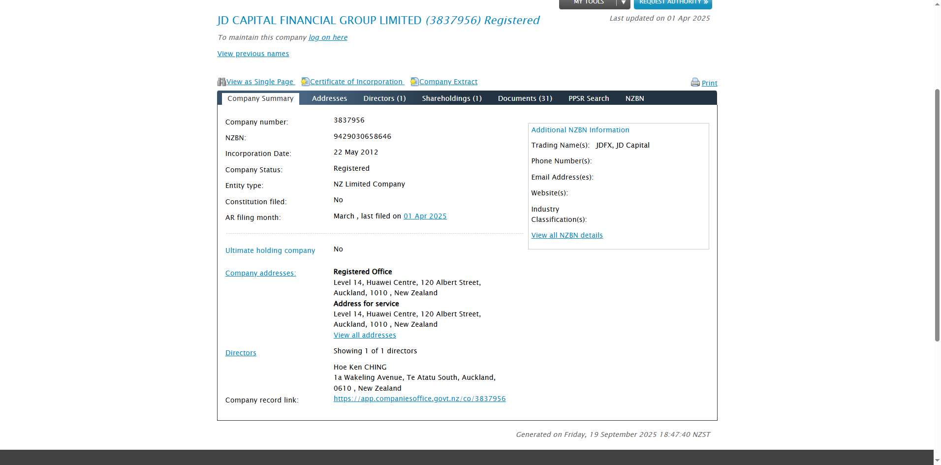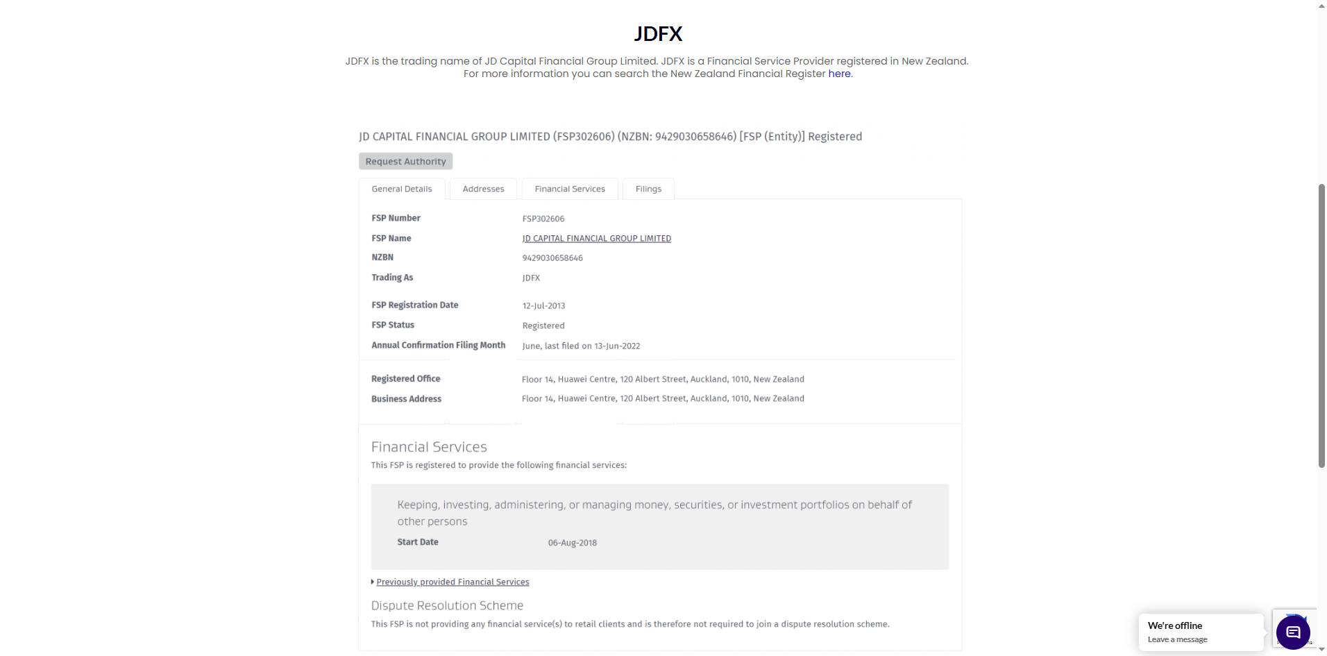 JDFX claims to have been established in 2012 and is operated by JD Capital Financial Group Ltd, based in New Zealand. It states that it is registered as a New Zealand Financial Service Provider. While we have verified that this company does appear in the Financial Service Providers Register, several critical concerns have been identified.