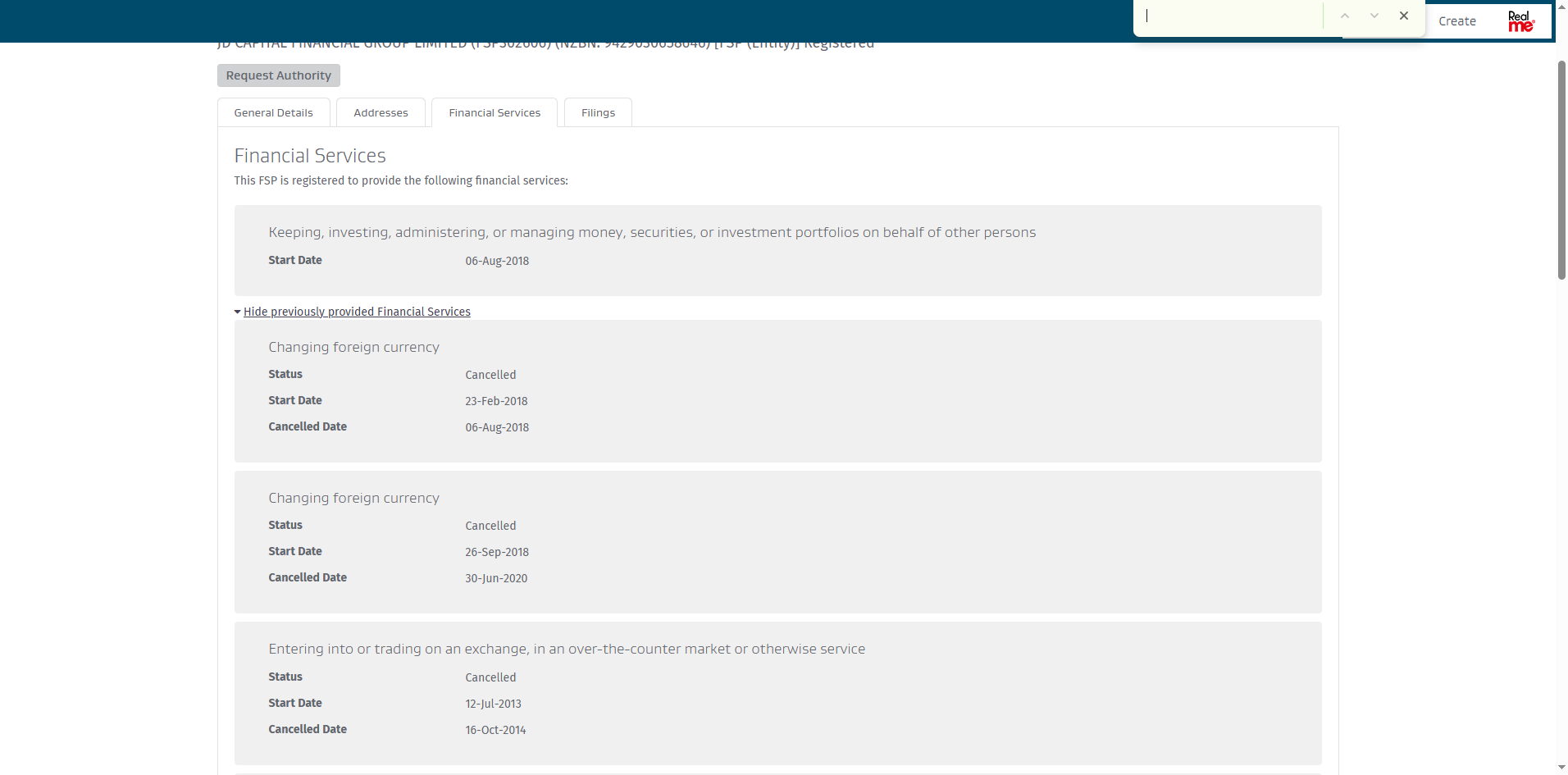 First, the registration does not list any associated website domains, making it impossible to confirm the legitimacy of JDFX platform. Second, and more importantly, the record indicates that JDFX does not hold license to provide retail financial services. Many of the listed financial services under this registration are marked as "cancelled."