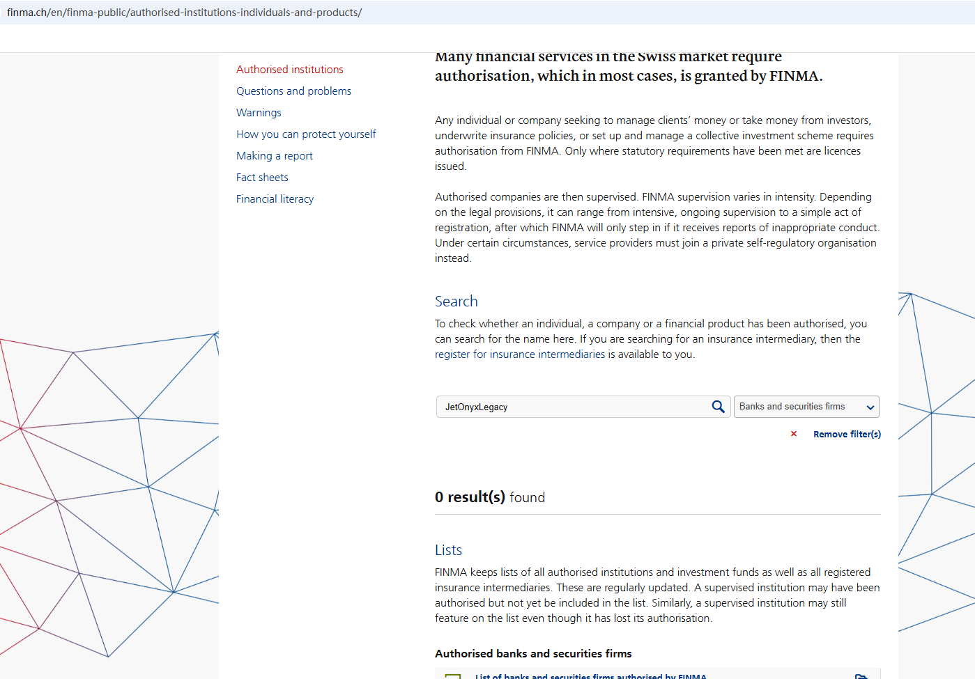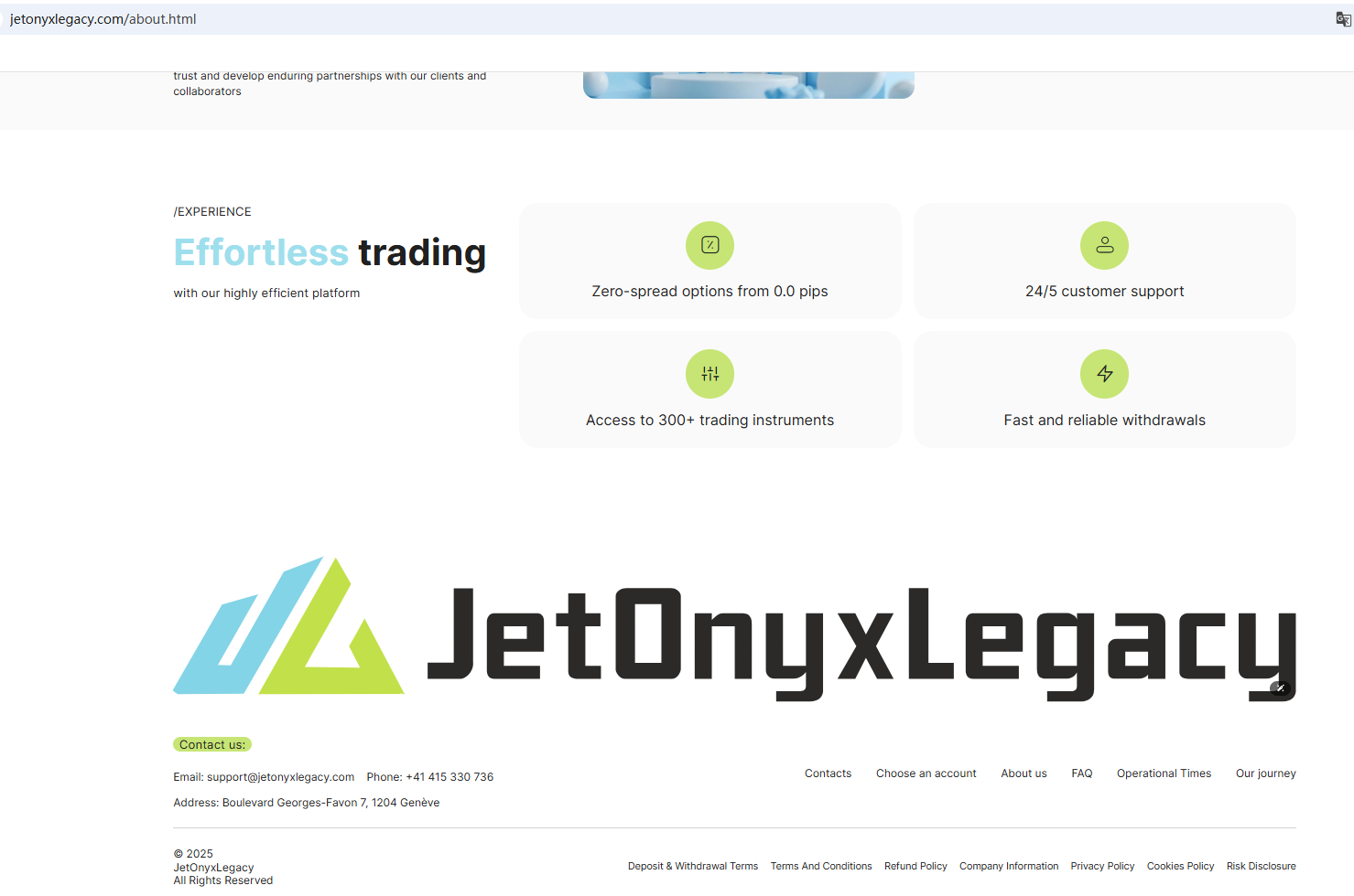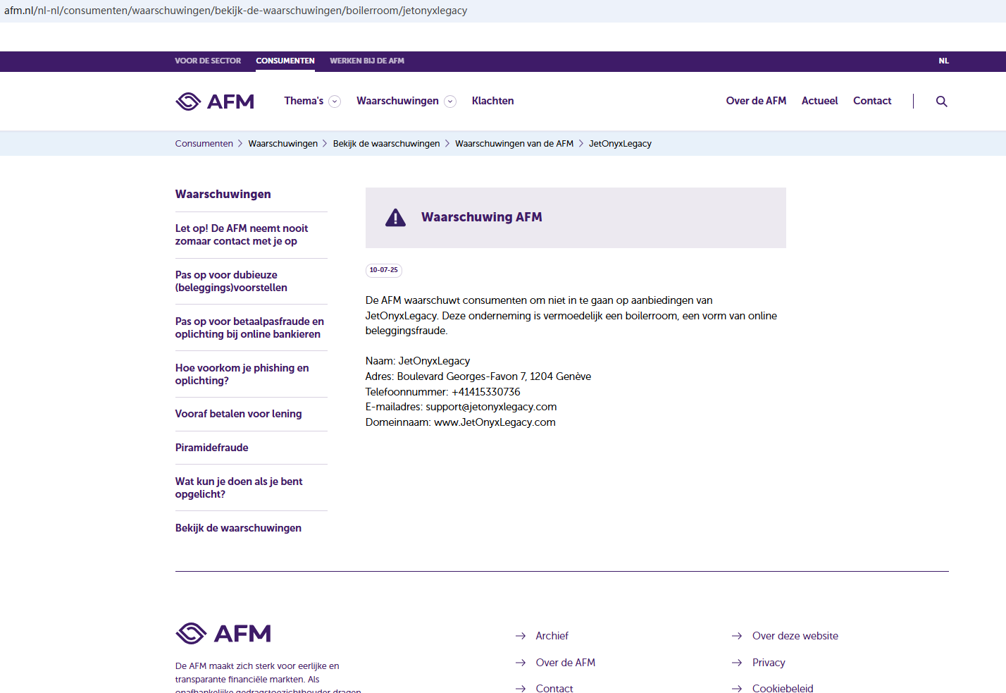 According to its website, it is located in Genève. Upon investigation, no matching information was found in the Swiss Financial Market Supervisory Authority (FINMA). In addition, the Netherlands Authority For the Financial Markets (AFM) issued a warning against JetOnyxLegacy, believing this company might be providing financial services or products without proper authorization.