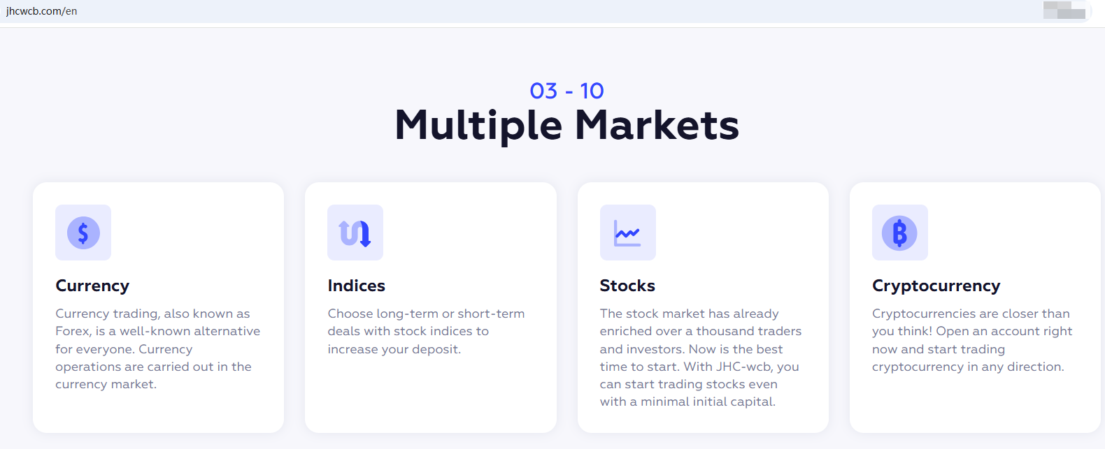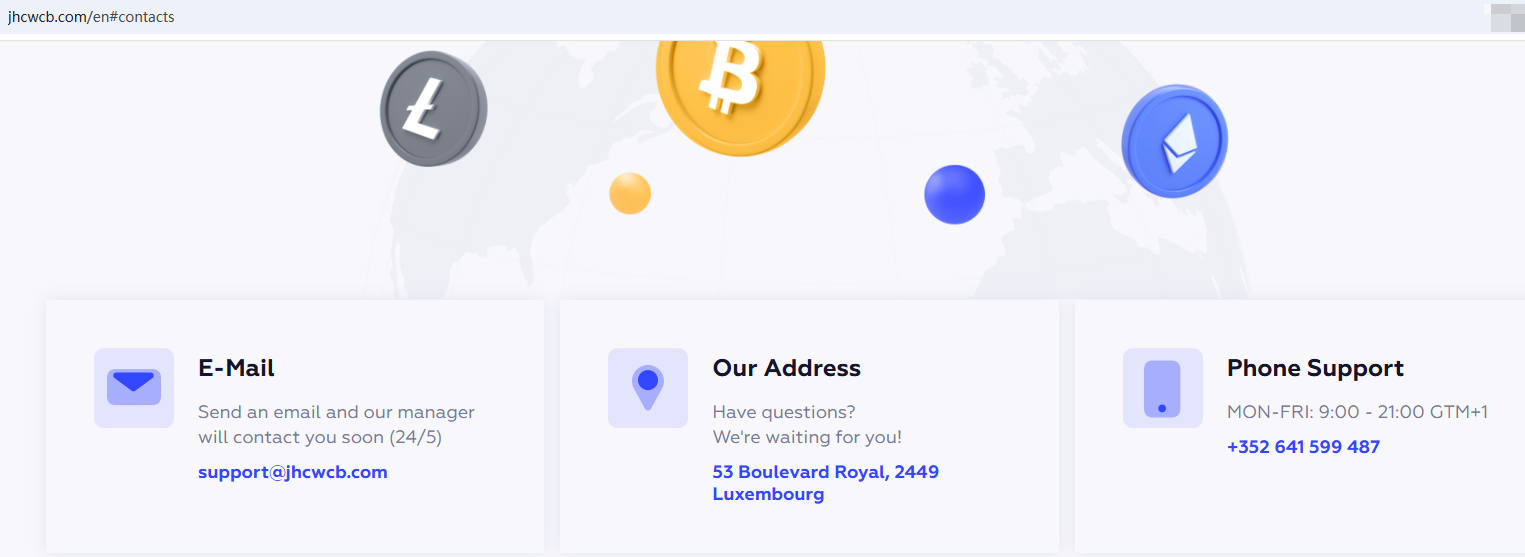 JHC-wcb claims to be a online broker located in Luxembourg, offering a range of investment products to traders, including Currency, Indices, Stocks, Cryptocurrency and more instruments for trading in global markets. But it lacks detailed regulatory information. A company that offers financial services must have financial license in the country where it is located.
