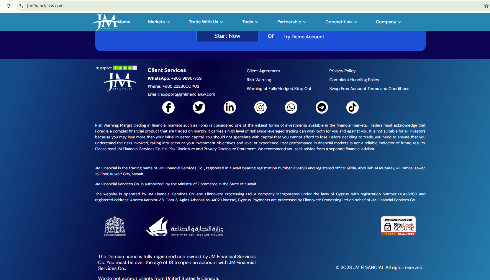 JM Financial claims to be operated by JM Financial Services Co., allegedly authorized by the Ministry of Commerce in the State of Kuwait, and run by Elinnovate Processing Ltd, supposedly registered in Cyprus. However, registration with the Ministry of Commerce in Kuwait alone does not constitute valid authorization to offer financial services. The Central Bank of Kuwait has explicitly stated that they do not supervise forex trading activities, meaning JM Financial is not operating in a regulated environment. Additionally, there are no indications that Elinnovate Processing Ltd is licensed by the Cyprus Securities and Exchange Commission (CySEC).