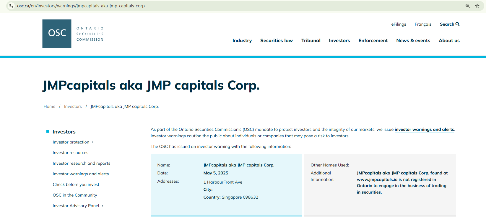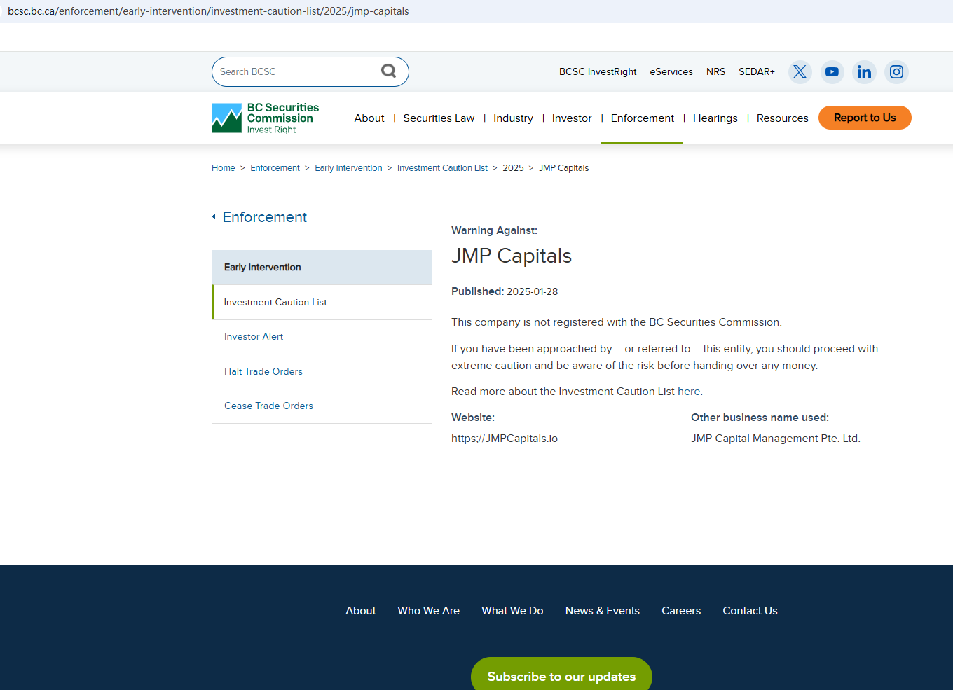 On 28 January 2025, the British Columbia Securities Commission (BCSC) issued a warning that JMP Capitals was providing financial services or products without authorisation. You may visit: https://www.bcsc.bc.ca/enforcement/early-intervention/investment-caution-list/2025/jmp-capitals