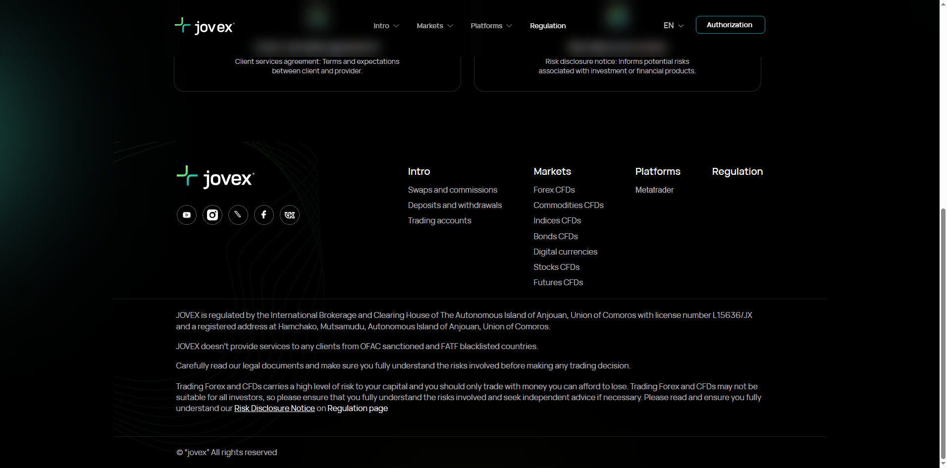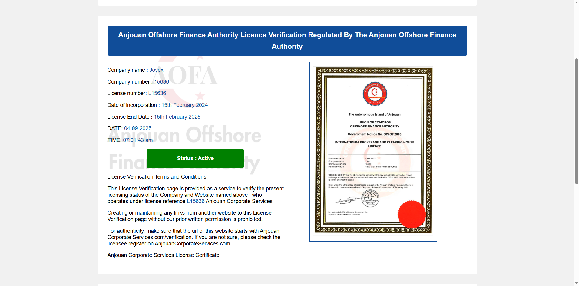 Jovex claims to be registered and regulated by the Anjouan Offshore Finance Authority (AOFA) in Comoros. While we found a matching entity in the AOFA registry effective from 15th February 2025, the authority does not publish associated domain names or websites, making it impossible to verify whether the licensed entity is genuinely linked to the Jovex platform. More importantly, AOFA is widely regarded as a weak offshore regulator with minimal oversight, poor transparency, and extremely limited investor protection. Its licenses are often easily obtained and do not ensure financial accountability or legal recourse for investors. Given these serious concerns about regulatory credibility and verification, we consider Jovex to pose a high risk and mark it as a scam.