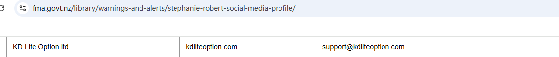On May 5, 2025, the New Zealand Financial Markets Authority (NZ FMA) added KD Lite Option ltd to its warning list, stating that this is a fake investment platform. https://www.fma.govt.nz/library/warnings-and-alerts/stephanie-robert-social-media-profile/