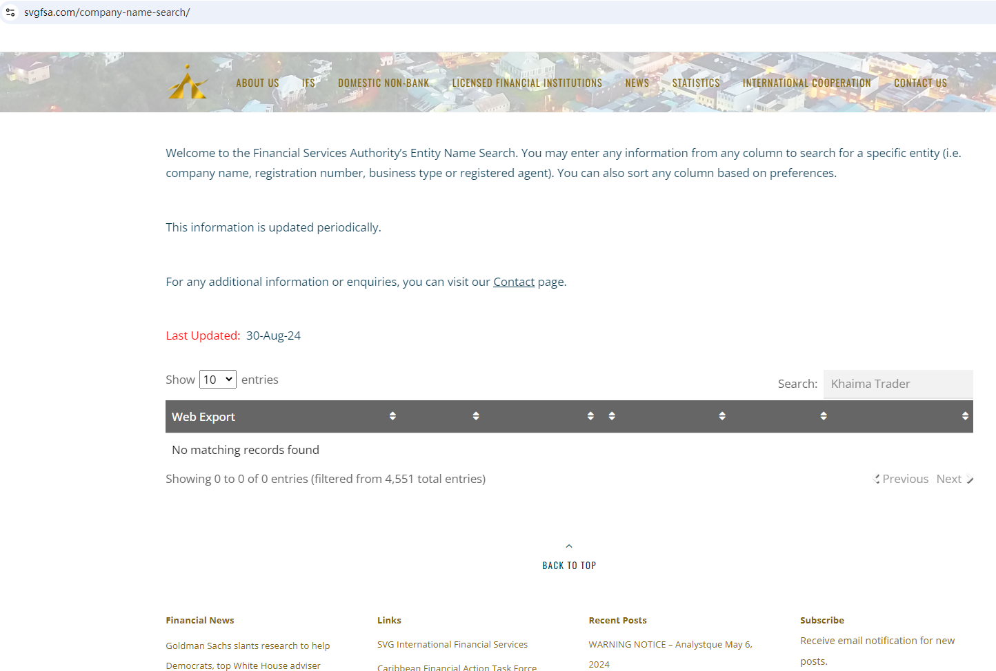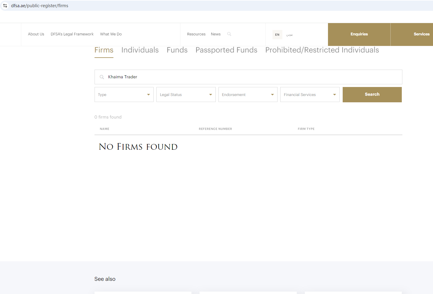 Its website provides an address and mailing address. Upon investigation, no matching information was found in the Securities and Commodities Authority (SCA), Dubai Financial Services Authority (DFSA), Central Bank of U.A.E. (CBUAE), and Financial Services Authority (FSA).