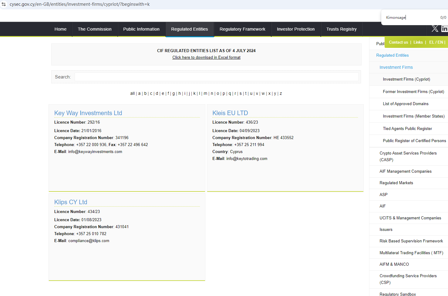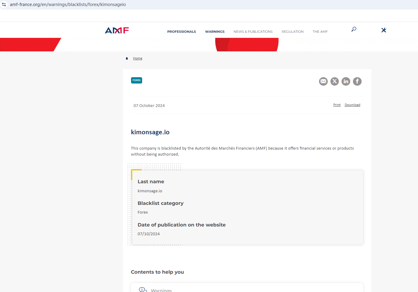 In addition, the Financial Authority (Autorité des Marchés Financiers, AMF) added Kimonsage to the warning list for it being an unauthorized company engaging in forex activities.