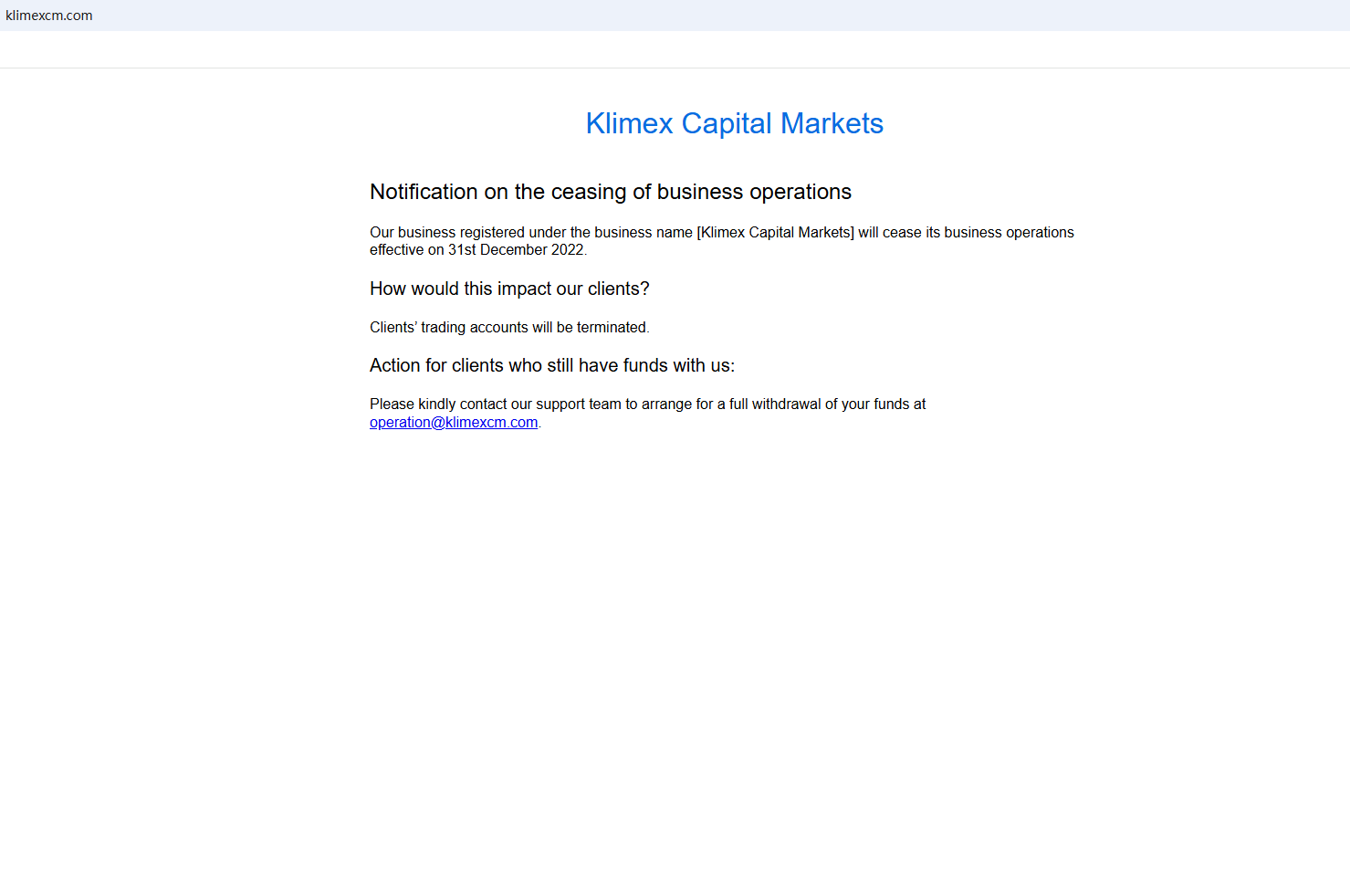 The website has announced that it has ceased operations and its previous claims of being regulated by the Vanuatu Financial Services Commission (VFSC) no longer exist. All these signs indicate that Klimex faces significant risks. Investors should monitor developments and remain vigilant.