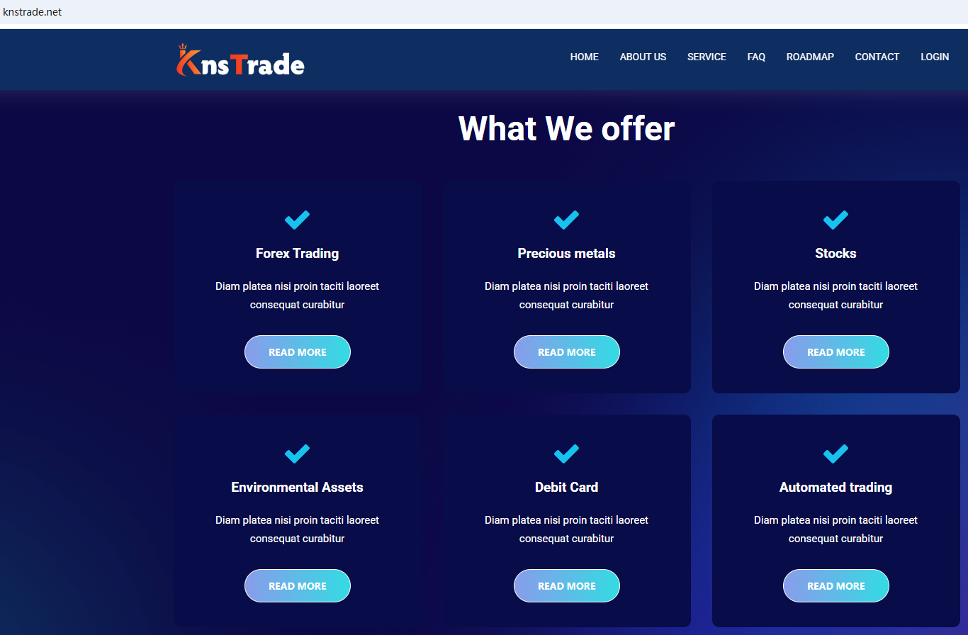 KnsTrade claims to be a investment platform, offering a range of investment products to traders, including Forex, Precious metals, Stocks and more instruments for trading in global markets. But it does not give information about his country of origin. A company that offers financial services must give an address and have a financial license in the country where it is located.
